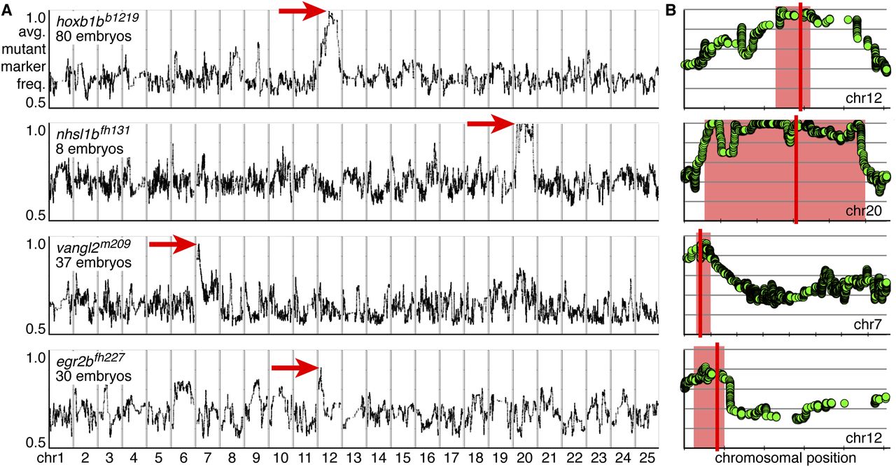 RNA-seq–based mapping identifies single peaks of linkage centered on the known mutations in all experiments. (A,B) Rows represent individual experiments and are labeled by genotype and the number of mutant embryos used for mapping. (A) Genome-wide mapping data. The average frequency of mutant markers (black marks) is plotted against genomic position. In each case, a single region emerges with an allele frequency near one (red arrow). Each chromosome is separated by vertical lines and labeled at the bottom. (B) Detail of the chromosome containing the linked interval for a given experiment (row). The average frequency of mutant markers (green discs) is plotted against chromosomal position. A red box marks each region of linkage, and a red line marks the position of the known mutation. Each tick mark on the x-axis represents 10 Mb. Each y-axis is the same as in A, first row.