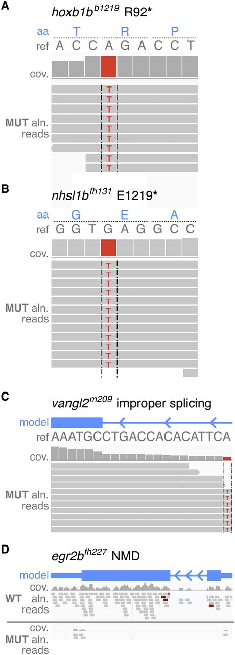 RNA-seq–based mapping identifies candidate mutations creating nonsense and missense changes, affecting splicing, and affecting gene expression. Reads are shown aligned to each known lesion site. Aligned reads are shown as gray boxes; differences from reference (ref) are highlighted by colored letters. (aa) Amino acid; (cov) coverage; (aln) aligned. (A–C) RNA-seq data from the mutant pool identified the known A-to-T transversion in hoxb1bb1219 (A), the G-to-T transversion in nhsl1bfh131 (B), both creating stop codons, and the creation of a splice acceptor introducing 15 bp of intronic sequence in the vangl2m209 mutation (C). (D) The down-regulation of egr2b (via NMD of the egr2bfh227 nonsense mutation) is evident in a comparison of the wild-type and mutant aligned reads (identified as significantly down-regulated by 25-fold via Cufflinks, q = 0.00011423).