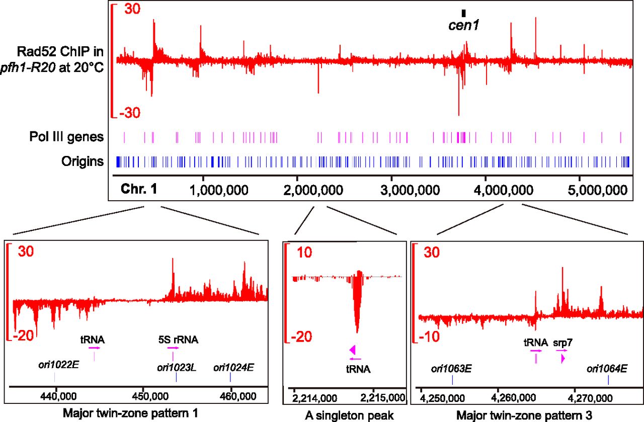 Rad52 enrichment patterns in pfh1-R20. Rad52 SPI-seq read distribution along chromosome 1 in pfh1-R20 at 20°C. The units on the y-axes are reads per 10 million. The positions and naming of replication origins are as described by Hayashi et al. (2007).