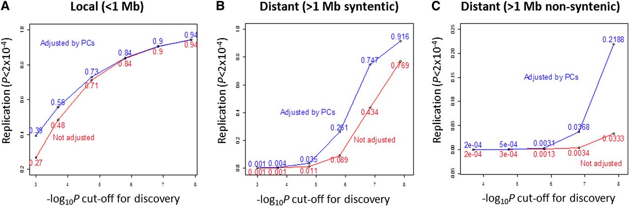 Replication rate by distance from the eQTL to the transcript. (Red lines) Replication of eQTL. (A) Local effect; (B) distant syntenic effect (>1 Mb but gene and SNP on the same chromosome); and (C) distant effect (on a different chromosome). The analysis is based on autosomal SNPs from the Illumina 300K panel.