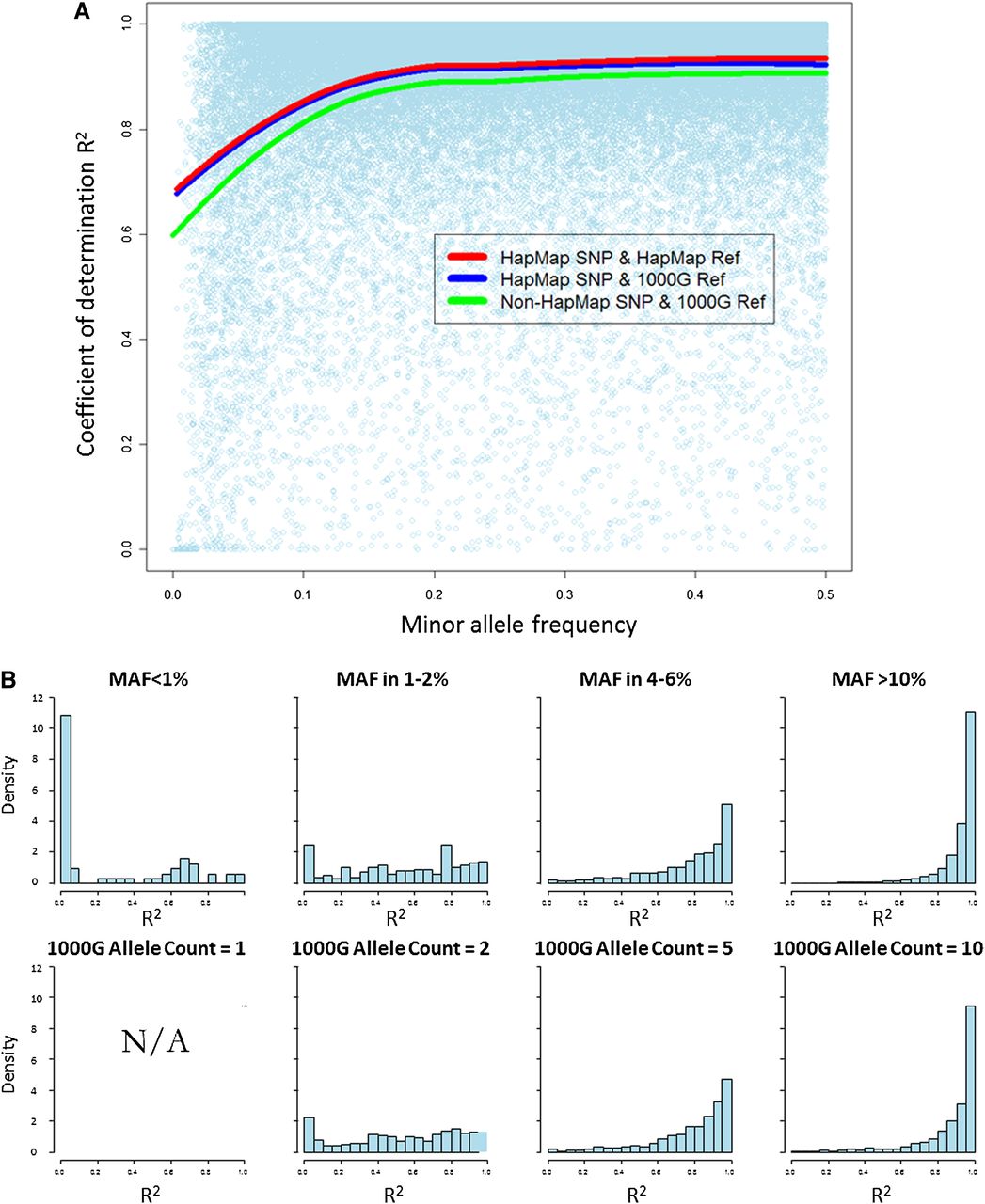 Imputation accuracy by minor allele frequency (MAF; MRCA panel). (A) Correlation (R2) between 1000G imputed allele dosage derived from Illumina 300K arrays and true allele counts measured by Illumina 100K arrays, plotted by MAF. (B) Histogram of correlation with true allele counts by MAF in sample (upper panels) and minor allele counts in the 1000G reference haplotype. Note that there are no data in the bottom left panel following removal of singletons from the reference haplotype.