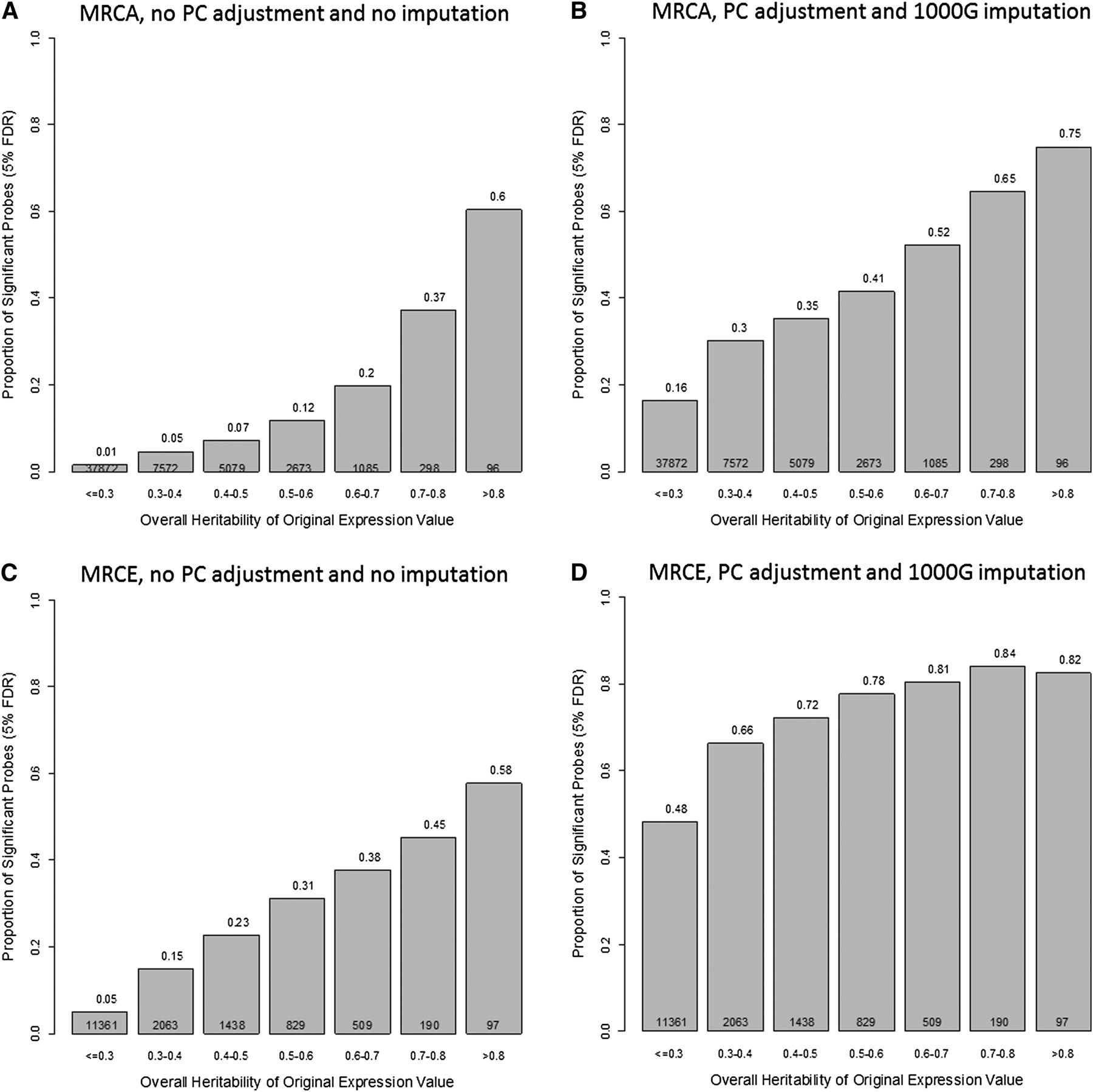Proportion of significant transcripts by overall heritability. (A) Unadjusted expression data and SNPs from the Illumina 300K panel in the MRCA subjects. (B) PC-adjusted expression data and the imputation of 1000G SNPs in the MRCA subjects. (C) Unadjusted expression data and SNPs from the Illumina 300K panel in the MRCE subjects. (D) PC-adjusted expression data and the imputation of 1000G SNPs in the MRCE subjects. The number of transcripts in each heritability category is given at the bottom of each bar.