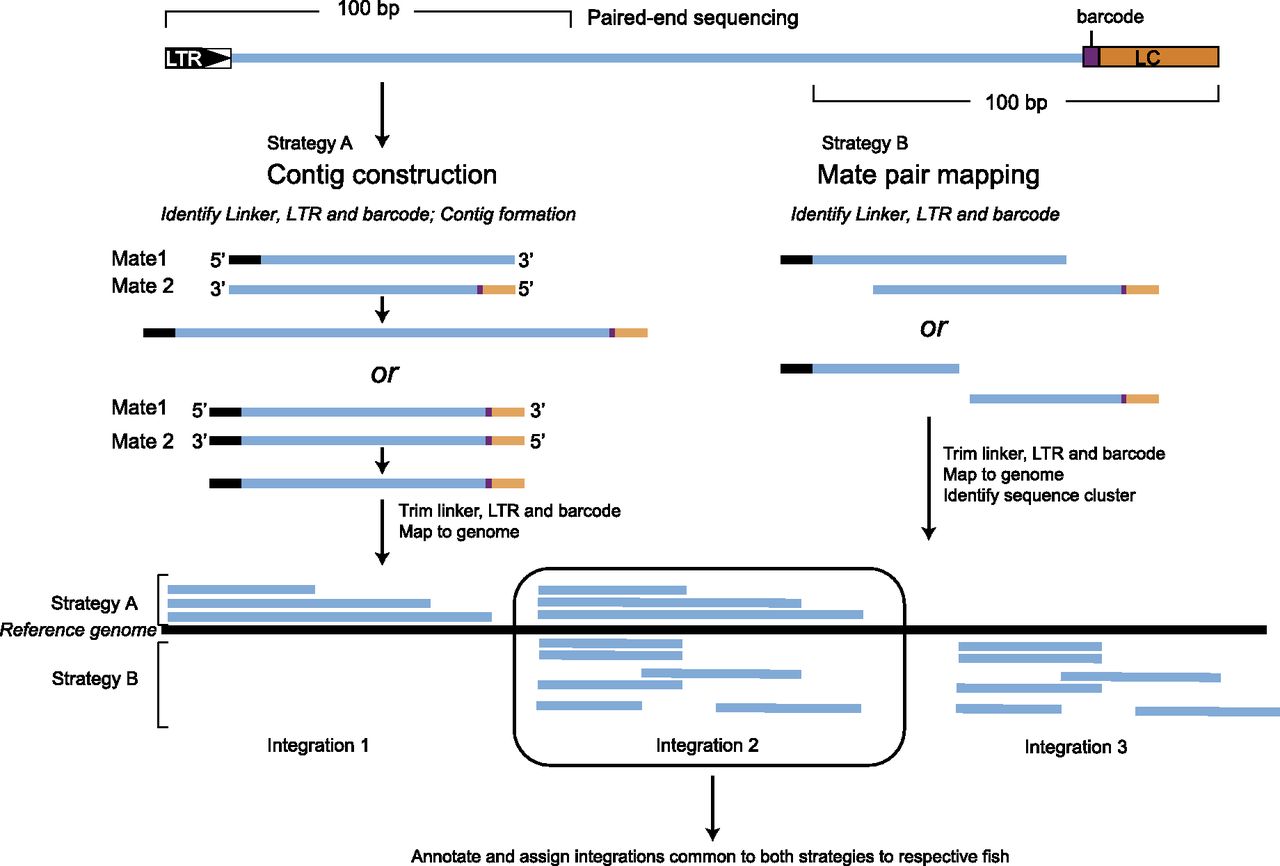 Strategies for mapping retroviral integrations. Paired-end sequencing was performed to capture the site of the retroviral integration (designated by LTR–retroviral 3′ long terminal repeat) and the linker cassette (LC) that contains the “barcode” identifier for the specific sample. Two strategies were used to map the integrations as this proved to be less error-prone than either strategy alone. In Strategy A, pairwise alignment of paired-end reads was performed to create contigs, and the resulting contigs were mapped to the zebrafish genome. Only contigs that mapped unambiguously were considered for identifying integrations. In Strategy B, each read from corresponding paired-ends was mapped independently, and colocalization in the correct orientation (pointing at each other) was used as the criterion for correct mapping. Integrations that mapped to the same genomic coordinates by both strategies were used for identification of integration events.