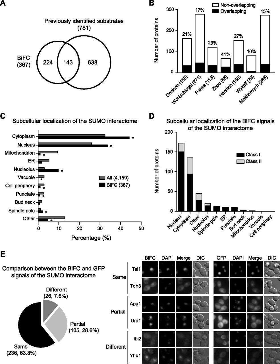 Characterization of the SUMO interactome. (A) Venn diagram depicting the comparison of the SUMO substrates identified in this study and those identified in seven previous analyses. (B) Bar graph depicting the comparison between the SUMO interactome and each of the seven previous data sets. The black and white bars indicate the number of SUMO substrates that overlap and do not overlap, respectively, with the data set in this study. The percentage of concordance between data sets is indicated above the bars. Numbers in parentheses indicate the number of SUMO substrates identified in each study. (C) Percentage of total hits for each subcellular localization of the SUMO substrates from the two data sets (All and BiFC). (All) Whole proteins for which subcellular localization has been annotated in the yeast GFP fusion localization database (http://yeastgfp.yeastgenome.org). (BiFC) SUMO interactome identified in this study. (Asterisks) Significant difference compared with All (P < 0.05; two-sided Fisher's exact test). (D) The number of hits for each subcellular localization of the BiFC signals. The black and gray bars indicate the number of substrates belonging to class I and class II, respectively. (E) (Left panel) Venn diagram depicting the comparison between the BiFC signal and GFP signal of each protein in the SUMO interactome. (Right panel) Fluorescence images of Tal1 and Tdh3, Apa1 and Ura1, and Ibi2 and Yhb1, which exhibit the same, partial, and different localization, respectively, between the BiFC and GFP signals.