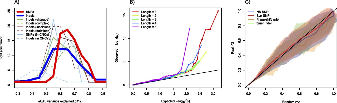 Indels influencing gene expression and disease. (A) Distribution of relative frequencies (y-axis) with which variants drawn from several classes (see legend) explain a certain fraction of the variance in exonic gene expression levels (x-axis, measured by R2, Pearson's correlation coefficient squared). For each variant, the exon showing the highest association was taken. Frequencies are shown relative to the distribution obtained from 100 permutations (for details, see Supplemental Information). (B) QQ plots of Spearman association P-values for coding indels by exon-level gene expression are stratified by indel length. Here, the enrichment of P-values for indels of length 1, 2, 4, and 5 relative to length 3 (green-line) is indicative of nonsense-mediated decay. For associations at an FDR of 0.20, this difference trended to significance for polarized indels (P = 0.10) and was significant for polarized and slippage indels (P = 0.04). (C) QQ plots of the distribution of linkage (r2) between GWA variants and nearby protein-coding variants (y-axis; four classes of variants), against a background distribution obtained from randomly drawn SNPs chosen to be controlled for excess linkage, and frequency-matched and chromosome-matched with the set of GWA SNPs (x-axis) (Supplemental Information). The central line and standard errors of these QQ curves were obtained by repeating the procedure 100 times. The SNP and indel r2 distributions and standard errors (displayed as a cloud) tracked each other across all observed values.