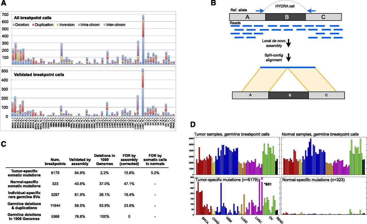 HYDRA-MULTI breakpoint calls. (A) Stacked bar graph displaying the number of SVs in each tumor, with different SV classes shown as different colors. The top plot has all SV calls; below are the calls validated by assembly. In the legend, deletions, tandem duplications, and inversions are smaller than 1 Mb; (intra-chrom) intra-chromosomal rearrangements larger than 1 Mb; (inter-chrom) inter-chromosomal rearrangements. (B) Assembly-based validation of a breakpoint call corresponding to deletion of the “B” segment. Read pairs in which one or the other read maps near a breakpoint prediction are extracted and subjected to de novo assembly. Contigs are then aligned to the reference genome. Split alignments detecting breakpoints consistent with the original call are judged as validated. (C) Table showing the validation results for different breakpoint callsets. From top to bottom, the rows correspond to somatic mutations predicted in a single tumor sample, “somatic mutations” predicted in a single normal sample, SV calls present in a single tumor–normal pair, germline control breakpoints, and germline deletion calls that were also found by the 1000 Genomes Project. The “Deletions in 1000 Genomes” column shows, for each subset of calls shown in rows, the percentage of deletions that were also found by 1000 Genomes, defined as 50% reciprocal overlap. The last two columns show the FDR by assembly, and by assessing the number of normal specific somatic mutations. (D) The top two panels show the number of germline breakpoint calls found in tumor (left) and normal (right) samples. The bottom panel shows the number of breakpoint calls found in a single tumor sample (left), but no other sample, or a single normal sample (right).