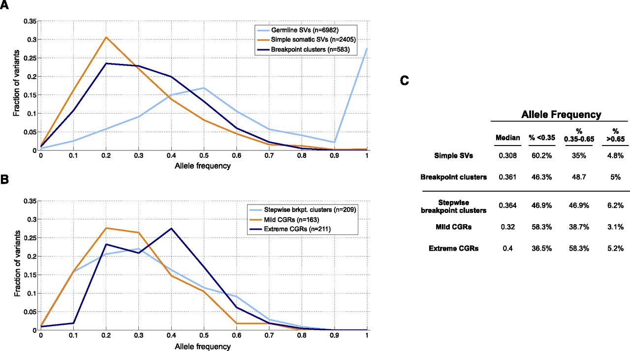 Intra-tumor breakpoint allele frequency (BAF). (A) BAF distribution for germline duplications and deletions (light blue), simple SVs (orange), and complex breakpoint clusters (dark blue). For germline breakpoints present in multiple samples, each BAF measurement of that breakpoint is shown. (B) BAF distribution for stepwise and complex rearrangements. (C) Table showing the median BAF for different breakpoint classes, and the percentage of breakpoints that have low (<0.35), high (0.35–0.65), and unusually high (>0.65) BAF.
