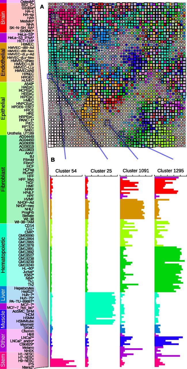SOM clustering of DHS profiles. (A) A 50 × 50 self-organizing map (SOM). Each box represents a cluster of DHSs with similar DNase-seq signal profiles across samples, color-coded by tissue (legend, left). Cluster color corresponds to the combination of cell types in which the associated DHSs have high signal in the detailed profile. Square size indicates the number of DHSs assigned. (B) Average DHS profiles across samples for four individual clusters. Clusters contain sites open in highly related cell types (54 and 25) and less related cell types (1091 and 1295). (*) Malignant samples.