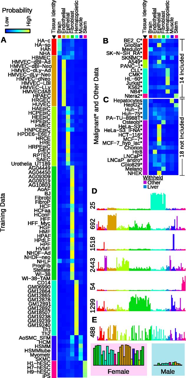 Tissue and sex classifiers based on DNase I data. Predictions from a multinomial logistic regression classifier trained to predict tissue identity for a given sample with data from 43 DHSs. (A) Predictions for training data, along with known tissue of origin (left column). Colors within the heatmaps reflect the predicted probability of belonging to each of the seven tissue classes. (B) Predictions for malignant samples not included in the training, but whose presumed tissue of origin was included in the model. (*) Malignant samples. (C) Predictions for samples whose tissue (or presumed tissue) was excluded from the training because tissue types had fewer than five samples. (D) The DNase I signal profiles of seven (out of 43) clusters selected by the model with positive coefficients. (E) The DNase I profile for the single sex-specific site (chrX:130926460–130926610) selected by the classifier. The enlarged barplot shows the distinction between samples divided by sex for the subset of samples included in the model.