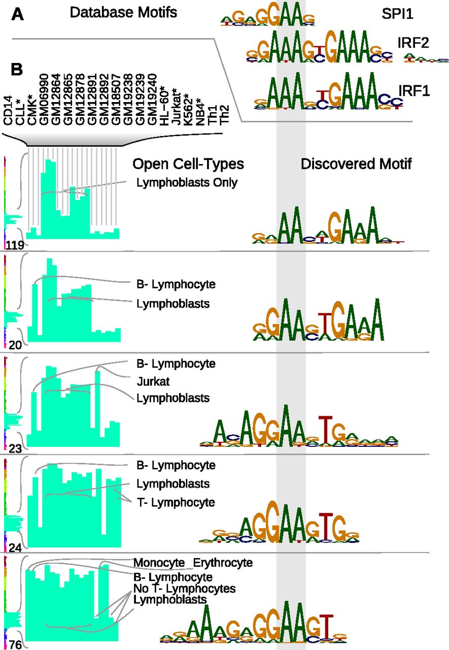 Variations in IRF-like motifs in hematopoietic clusters. (A) Motifs for IRFs and SPI1 from JASPAR show both common and distinct features. (B) MEME motifs discovered in several hematopoietic-specific clusters. The clusters vary in cell-type specificity among the hematopoietic cell types, and the motif logo varies as well, while retaining some semblance of the known SPI1/IRF family motifs.
