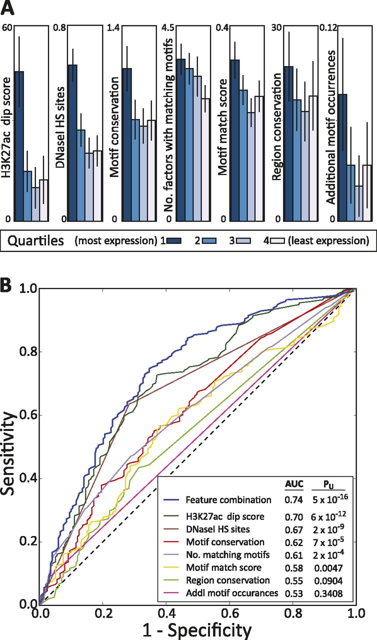 Importance of sequence context for enhancer function. (A) Association of top scoring enhancers with: the average H3K27ac signal value in the matched cell type 200 bp away, minus the value centered on the motif (in 25-bp windows); overlap with DNase I annotations in the matched data (Song et al. 2011); the raw motif conservation score (Kheradpour et al. 2007; Lindblad-Toh et al. 2011); the number of factors with matching motifs in regions outside of the motif match in the tested sequence; the strength of the motif match; the number of bases indicated as conserved by SiPhy-ω 12-mers (Garber et al. 2009); and the number of matches to the tested motif within the tested sequence. (B) Predictive power for recognizing enhancers that are likely to show high wild-type reporter expression based on each of these individual features and a combination of features using logistic regression (Hall et al. 2009).