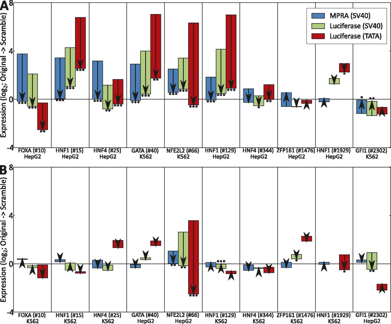 Robustness to tested sequence length and promoter type. (A) Comparison of MPRA (blue) vs. luciferase reporter assays (green/red) using 500-bp sequences instead of 145-bp and alternate promoters. For each of the 10 candidate enhancers, we list the predicted regulator, the enhancer ID (Supplemental Data S1), and the cell type in which the element was tested (matched cell type for predicted activators, unmatched for predicted repressors). Each bar indicates the expression of the original sequence and the effect of motif scrambling (direction of the arrow). MPRA experiments used 145-bp sequences centered on the motifs and a strong SV40 promoter (blue), and luciferase experiments used 500-bp sequences centered on the motifs with either a strong SV40 promoter (green) or TATA promoter (red). Data is normalized by subtracting from each expression value the mean for scrambles in that cell line across these 10 sequences. Asterisks indicate significance values using a t-test on the individual replicate values for the sequences (*) P < 0.05, (**) P < 0.01, (***) P < 0.001; see Methods (Mann-Whitney P-values are available in Supplemental Table S5). (B) Results for each of the sequences tested in A for the reverse cell type where the factor was not predicted to be active. A significant and large change was seen for NFE2L2 (#66), consistent with MPRA results. In addition, we observe significant, albeit smaller, luciferase changes for HNF1 (#129), ZFP161 (#1476), HNF1 (#1929), and GFI1 (#2302). Luciferase SV40 values for HNF1 (#1929) in K562 are absent due to a sample tracking error (see Supplemental Table S5).