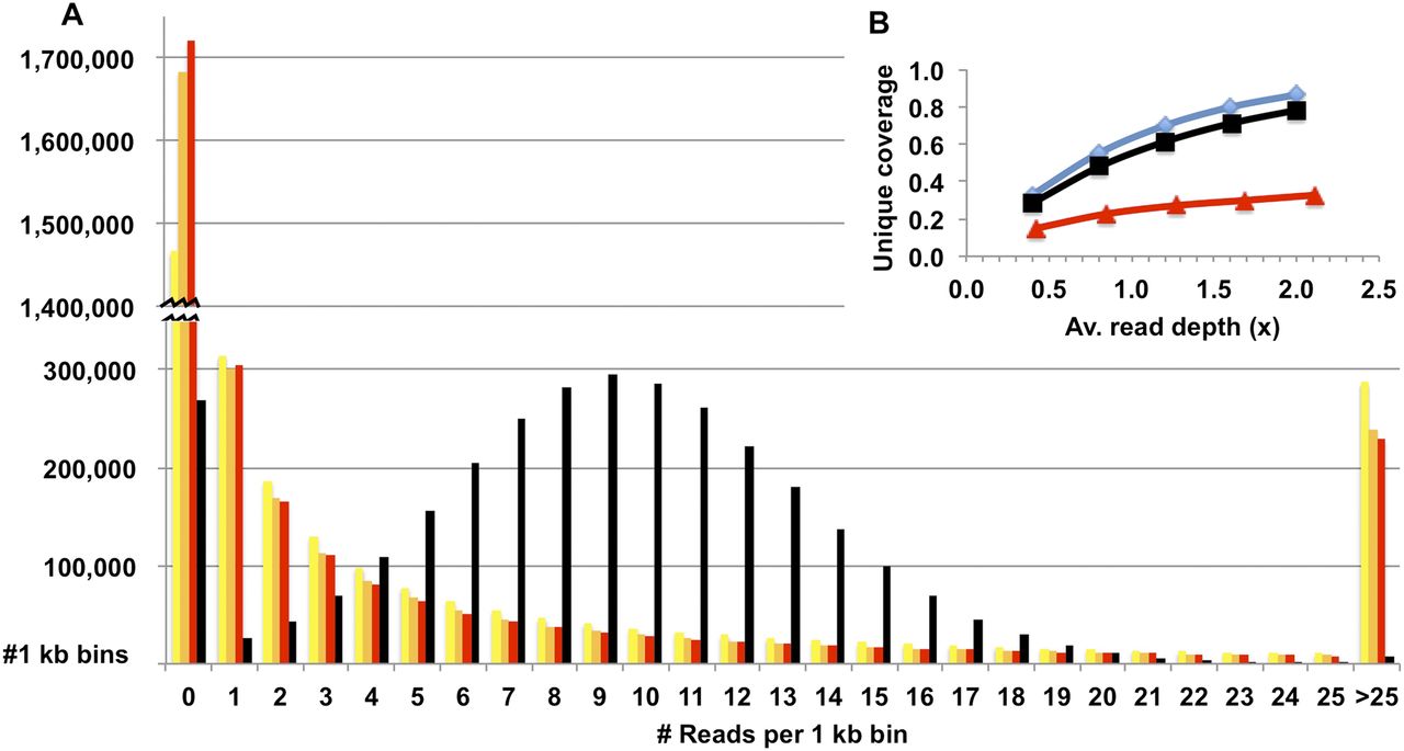 Genome coverage of mapped sequence reads from amplified sperm DNA and unamplified blood DNA. (A) Distribution of mapped reads from amplified DNA of three haploid sperm cells (yellow, orange, and red bars) and unamplified DNA from blood cells (black bars) after dividing the reference genome into nonoverlapping bins of 1-kb length. (B) Unique genome coverage with increasing read depth for libraries prepared from a single sperm cell (▴) or diploid blood cells (■). The ideal mapping to a nonrepetitive genome is included for comparison (♦).