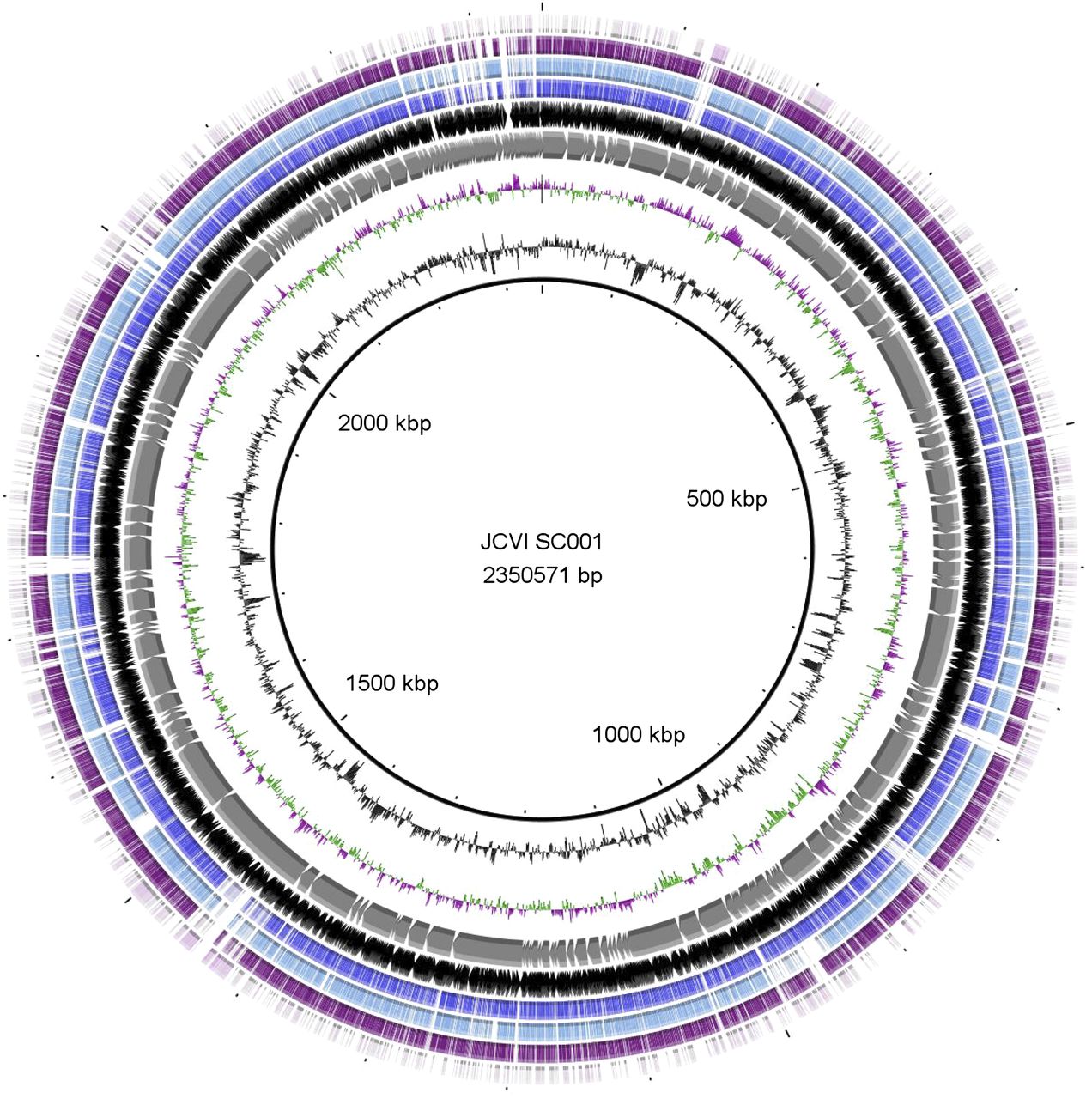 Circular representation of the draft JCVI SC001 genome. The assembled draft genome is the SPAdes assembly of MDA3 with the contigs ordered to the TDC60 reference genome. From the inner to the outer ring: coordinates in the assembled and concatenated JCVI SC001genome, G+C content, GCskew, ordered contigs, predicted CDS, TBLASTN alignment showing percent identity against P. gingivalis TDC60, W83, ATCC 33277, and Prevotella buccae ATCC33574 (near neighbor) reference genomes.