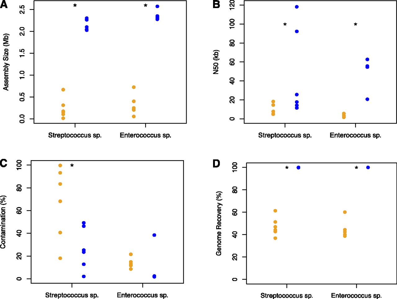 Sequencing results of amplified single cells and GMDs. (Blue circles) GMDs; (orange circles) single cells. (A) Assembly size; (B) largest contig; (C) percent contamination. (D) Genome recovery as measured by mapped reads to the best GMD assembly. (*) Statistical significance for that comparison (P < 0.05).