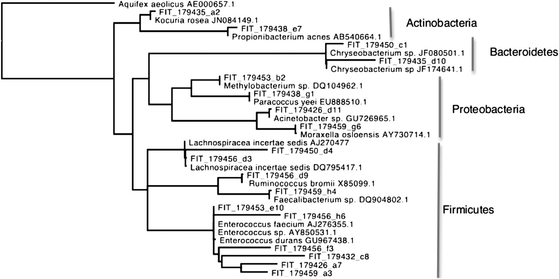 Phylogeny of OTUs recovered from GMDs. GMDs occupied by a growing colony of bacteria extracted from feces were sorted for MDA. 16S rDNA was amplified and sequenced. The maximum likelihood tree below represents the diversity of 16S rDNA sequences binned into OTUs at 90% sequence similarity. Related sequences were included to show relationships. Support values are omitted for clarity.