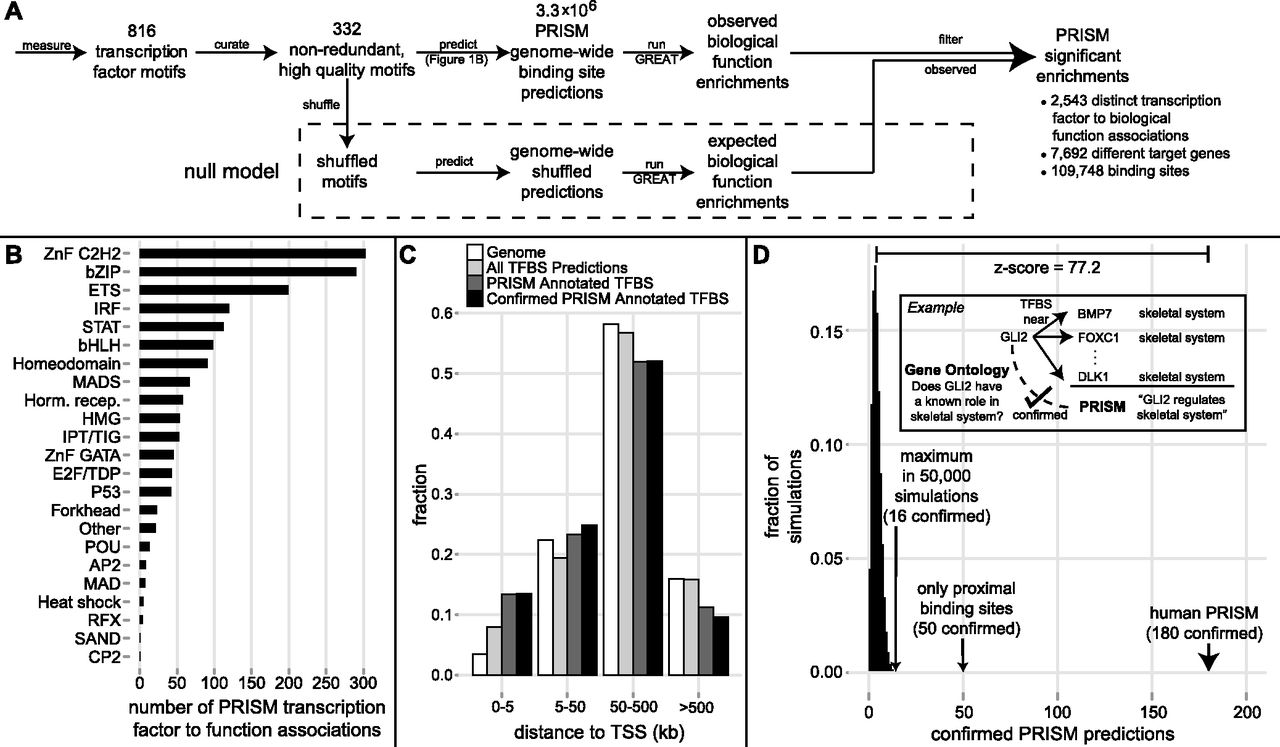 PRISM transcription factor and binding site function predictions. (A) PRISM combines excess conservation binding site prediction (Fig. 1) with GREAT function prediction from proximal and distal sites into a novel statistical framework to arrive at thousands of transcription factor (TF) function predictions, at a false discovery rate of 16%. Numbers are summed over human and mouse (see text). (B) Distribution of PRISM human TF function prediction across the major DNA binding families. (C) Most of the binding sites that support PRISM predictions—including high confidence confirmed predictions—are distal from putative target genes. (D) PRISM predictions are highly enriched for support by previous literature. The GREAT ontologies tag the transcription factor itself with the function predicted by PRISM as enriched among its target genes 180 (11%) times, Z-score = 77, P < 1/50,000 simulation runs (red); 3.6-fold enriched over using only proximal binding sites.