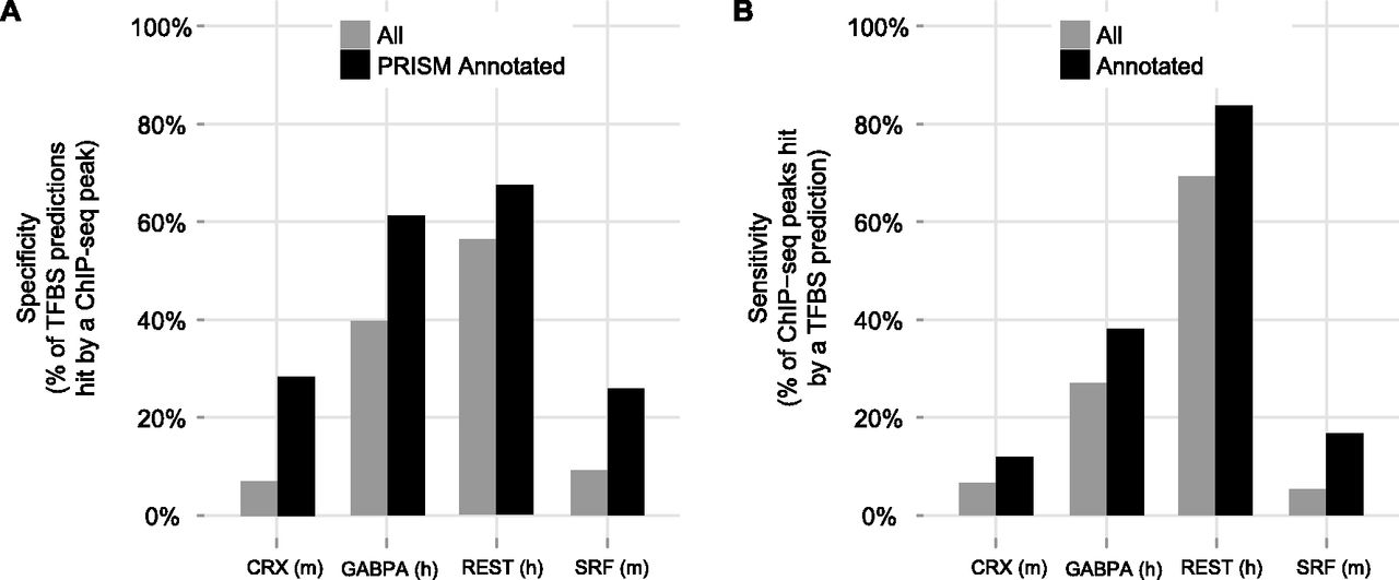 Overlap of PRISM binding site predictions with ChIP-seq. PRISM binding site predictions for CRX (m = mouse), GABPA (h = human), REST (human), and SRF (mouse) were overlapped with ChIP-seq binding sites for the same four factors. Overlap was observed both for the full set of binding site predictions and a subset annotated by PRISM in a particular functional role (“sensory perception of light stimulus” for CRX, “translation” for GABPA, “neurotransmitter transport” for REST, and “actin cytoskeleton” for SRF). (A) Percent of PRISM binding site predictions hit by a ChIP-seq peak. (B) Percent of ChIP-seq peaks hit by a PRISM binding site prediction. Only ChIP-seq peaks with a match to the transcription factor motif in the reference species were considered (CRX: 74%; GABPA: 81%; REST: 60%; SRF: 34%).