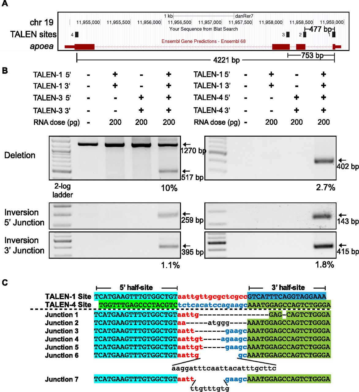 TALEN-generated 750-bp and 4.2-kb deletions within the zebrafish apoea locus. (A) Schematic diagram of the apoea locus demarcating the positions of all four TALEN binding sites and the distance separating them. (B) Segmental deletions of 750 bp and 4.2 kb are readily detected in normal-appearing TALEN-treated embryos when two TALENs are coinjected. The presence or absence of each TALEN component (5′ and 3′ recognition unit) is indicated above each gel lane, as is the dose of each component. PCR products corresponding to the desired 750-bp and 4.2-kb segmental deletion products (∼517 and ∼402 bp, respectively) are detected only in embryos injected with both TALENs. Estimated deletion rates are indicated below the positive lanes. Segmental inversions are detected in embryos treated with two TALENs for both the 750-bp and 4.2-kb segments. The calculated inversion rates are lower than the corresponding segmental deletions. (C) Junction sequences for the 4.2-kb segmental deletions at the apoea locus. The TALEN-1 and TALEN-4 recognition sequences are indicated above the junction sequences, where the half-sites recognized by each TALEN are differentially colored. The recovered junction sequences contain variable length deletions as well as evidence of insertions between some of the target sites, where the latter are indicated in plain text.