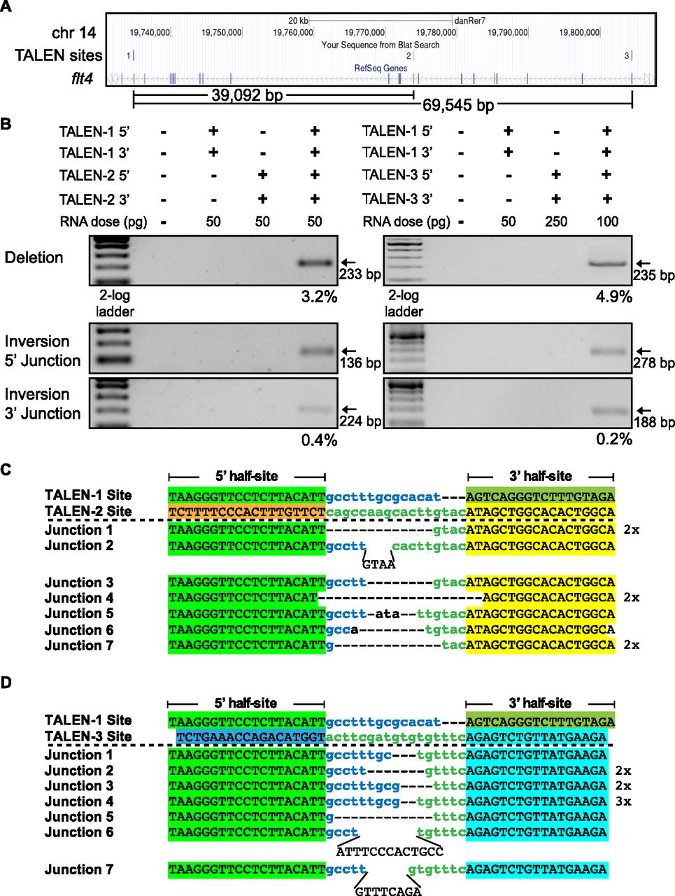 TALEN-generated 39-kb and 69-kb deletions within the zebrafish flt4 locus. (A) Schematic diagram of the flt4 locus demarcating the positions of all three TALEN binding sites and the distance separating them. (B) Segmental deletions of 39 and 69 kb are readily detected in normal-appearing TALEN-treated embryos when two TALENs are coinjected. The presence or absence of each TALEN component (5′ and 3′ recognition unit) is indicated above each gel lane, as is the dose of each TALEN component. PCR products corresponding to the desired 39-kb and 69-kb segmental deletion products are detected only in embryos injected with both TALENs. Estimated deletion rates are indicated below the positive lanes. Segmental inversions are detected in embryos treated with two TALENs for both segments, but at lower rates than the corresponding segmental deletions. Junction sequences for the 39-kb (C) and 69-kb (D) segmental deletions at the flt4 locus. The TALEN-1 and TALEN-2/3 recognition sequences are indicated above the junction sequences, where the half-sites recognized by each TALEN are differentially colored. In the recovered junction sequences, there are variable length deletions as well as evidence of insertions between some of the target sites, where the latter are indicated in plain text.