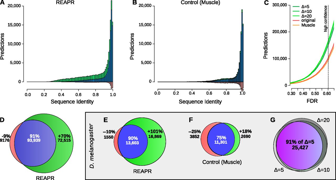 (A–D) High-confidence predictions in fly. Histogram of predictions by REAPR (Δ = 20) using structure-based realignment (A) or by a variant pipeline using purely sequence-based realignment as a function of average pairwise sequence identity (B). Predictions found after realignment (blue + green) are shown together with predictions found directly from the original WGA (blue + red). (C) Number of predictions in fly by REAPR (Δ = 5, 10, 20), the MUSCLE variant, and the original WGA as a function of the FDR set for these pipelines. Note how the MUSCLE curve almost coincides with the curve of predictions from the original WGA. (D) Venn diagram depicting the percentage gain and loss in predictions by REAPR relative to the number of predictions from the original WGA. There are many more novel predictions (green) by REAPR at lower sequence identities. (E–G) High-confidence predictions in D. melanogaster. Percentage gain and loss in predictions by REAPR (E) or by the MUSCLE variant (F) relative to the number of predictions from the original WGA. REAPR predicts roughly twice as many ncRNAs while the MUSCLE variant loses roughly as many predictions as it gains. (G) Overlap in predictions by REAPR under various deviation limits of Δ = 5, 10, 20. The mutual agreement is shown in purple. Predictions are robust to the deviation limit.