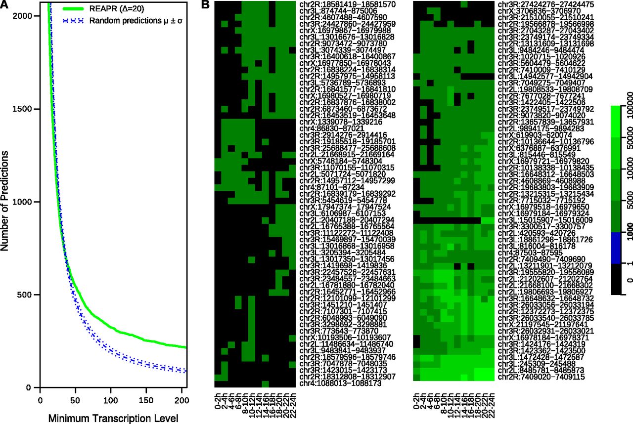 Transcription levels of novel predictions during D. melanogaster embryonic development. The level of each prediction was measured as the maximum number of RNA-seq reads overlapping the same position in a prediction. (A) The distribution of predictions as a function of the minimum transcription level. Levels were calculated using the reads from stage 20–22 h. We show high-confidence predictions from REAPR, Δ = 20 (green). Dashed blue lines represent the expected number of random predictions (μ) and the band of ±1 SD (σ). For example, there are 325 REAPR predictions, versus 200.6 (±15.2) random predictions on average, whose transcriptional levels are 100 reads or higher. (B) Transcription profiles of the 117 REAPR predictions whose levels are at least 1000 reads in at least one stage.