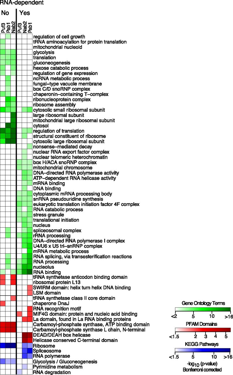 Differential enrichment of Gene Ontology terms, PFAM domains, and KEGG pathways. A heatmap showing the enrichment of Gene Ontology terms, PFAM domains, and KEGG pathways among the proteins we identified as RNA-dependent binders and those that were not (labeled “Yes” and “No,” respectively). Enrichment of Gene Ontology terms, PFAM domains, and KEGG pathways is depicted in green, red, and blue, respectively. Colors correspond to the negative log base 10 of the hypergeometric P-values. The columns are enrichment seen among proteins interacting in an RNA-dependent manner with Puf3, Pab1, or Nab2.