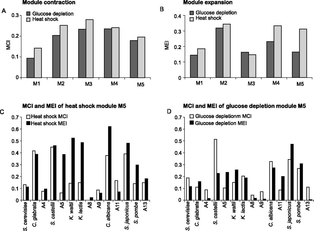 Module contraction and expansion in heat shock and glucose depletion. (A,B) Module contraction index (A) and module expansion index (B) in heat shock (gray) and glucose depletion (black) for each module M1–M5 (x-axis). Higher bars indicate a greater expansion (contraction) of a module. (C,D) MCI and MEI for the most induced heat shock module (C) and glucose depletion module (D) at individual phylogenetic points (x-axis).