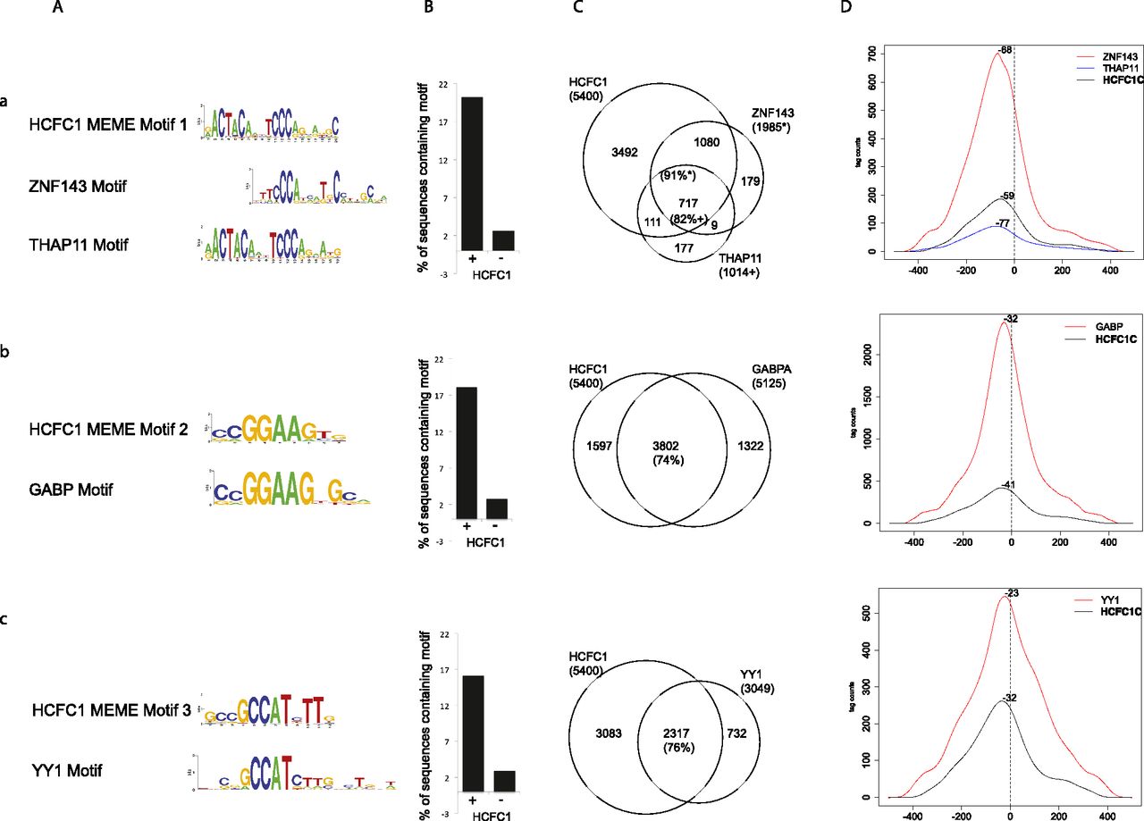 Identification of transcription factors associated with HCFC1-bound TSSs. (A) The HCFC1 MEME Motif logo identified in HCFC1-bound TSS-associated sequences is displayed above the most similar TRANSFAC motif(s). For HCFC1 MEME Motif 1, the motif corresponding to the experimentally described sequence for mouse Thap11 (Ronin) is also shown (Dejosez et al. 2010). (a) ZNF143 and THAP11; (b) GABP; (c) YY1. (B) Percentage of HCFC1-bound (+) or -unbound (−) sequences that contain the HCFC1 MEME motif. (C) Venn diagrams showing the overlap between HCFC1-bound TSS regions and ZNF143, THAP11, GABPA, and YY1-bound TSS regions as identified by ChIP-seq. The percentages of TSS regions that contain the transcription factor-binding sites and are HCFC1 positive are given. (*) Percentage of ZNF143 binding sites that are HCFC1 positive; (+) percentage of THAP11 binding sites that are HCFC1 positive. (D) Cumulative mapping of sequence tags around −250 to +250 of TSSs (determined as in Fig. 1E) shared between HCFC1C and the corresponding transcription factor. The most enriched position is indicated as the distance in base pairs from the TSS, which is indicated as a dashed vertical line.