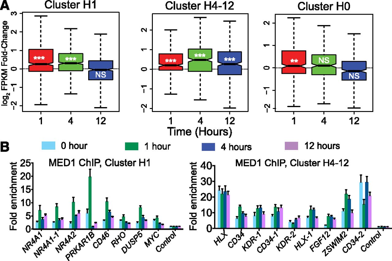 VEGFA-increased gene expression and mediator binding associated with dynamic H3K27ac loci in H1 and H4-12 clusters. (A) Fold change of differentially expressed genes within 100 kb of dynamic H3K27ac loci belonging to the indicated clusters, compared to 0 h. Line, boxes, and whiskers are as in Fig. 5A,B. Notches are a function of the interquartile difference and inversely related to the square root of the sample size. (***) P < 0.0001, (**) P < 0.001. (NS) Not significant. (B) MED1 ChIP-qPCR of dynamic H3K27ac loci belonging to H1 or H4-12 clusters.