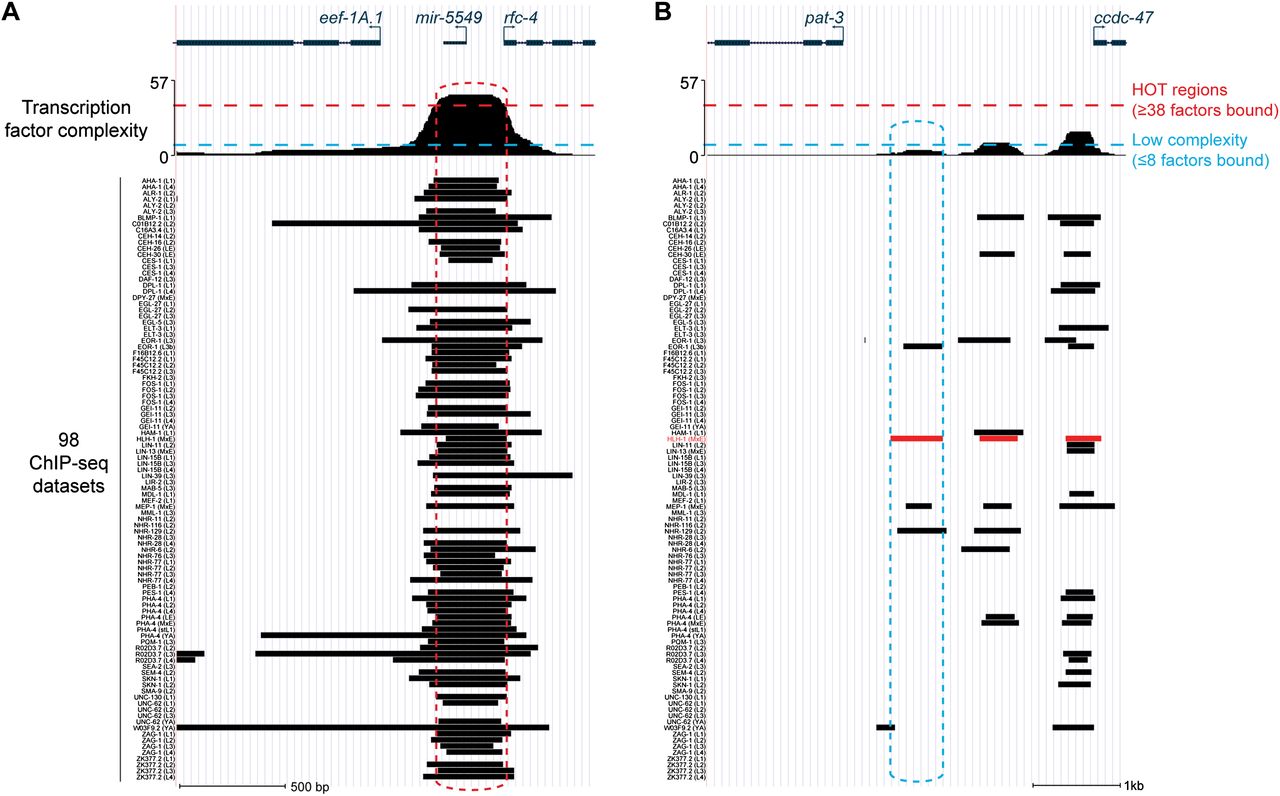 Examples of highly occupied and low-complexity regions of transcription factor binding. Binding of 57 transcription factors in one or more developmental stages (98 ChIP-seq data sets in total) were obtained from the C. elegans modENCODE Consortium and are shown for two examples. Data sets are shown in identical order to Supplemental Table 1. (A) Binding proximal to translation elongation factor 1-alpha homolog eef-1A.1. An ∼450-nt HOT region indicated by the red dashed box is significantly enriched for binding in ChIP-seq analyses of 44 different transcription factors. Transcription factor complexity (the number of factors with ChIP-seq binding sites overlapping that position) is shown at the top. (Below) Regions of significant enrichment (Q-value ≤ 10−5) observed in each of the 98 ChIP-seq data sets are shown as black boxes. (B) Low-complexity HLH-1 binding proximal to HLH-1–activated target pat-3 is shown.