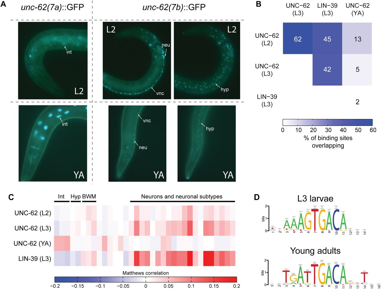 Distinct sets of targets bound by UNC-62 in L2/L3 larvae and adults. (A) Strains expressing isoform-specific unc-62 translational reporters show stage- and tissue-specific expression (Van Nostrand et al. 2013). (Left) unc-62(7a):GFP is not observed in early larval stages but is highly expressed in the intestine in late larval stages and young adults (YA). (Right) unc-62(7b):GFP is not observed in the intestine at any stage but is expressed in the hypodermis (hyp), the ventral nerve cord (vnc), and other neurons (neu). Strains were imaged in a glo-4(ok623) background to limit gut autofluorescence. (B) The overlap of ChIP-seq binding sites for UNC-62 in L2 and L3 larvae, young adults (YA), and HOX transcription factor LIN-39 in L3 are shown as the percentage of binding sites in the smaller set that are also bound in the larger. (C) Targets bound by UNC-62 in L2, L3, and YA, as well as those bound by LIN-39 in L3 larvae, were compared to genes enriched for expression in various tissues (Roy et al. 2002; Zhang et al. 2002; Colosimo et al. 2004; Fox et al. 2005; Pauli et al. 2006; Von Stetina et al. 2007; Spencer et al. 2011). Colors indicate the correlation between low-complexity target genes and genes with tissue-enriched expression for the indicated tissue. Tissues are clustered according to broad tissue types, and the specific tissue for each column is listed in Supplemental Figure 2 and Supplemental Table 3. (Int) Intestine; (Hyp) hypodermis; (BWM) body wall muscle. (D) A de novo motif search with RSAT (Thomas-Chollier et al. 2012) identifies sequences significantly enriched in the 100-bp central core region of UNC-62 binding sites. A total of 200-bp flanking regions on either side of this core were used as the background sequence set. Both motifs contain the D. melonogaster Homothorax motif (TGACA) (Noyes et al. 2008).