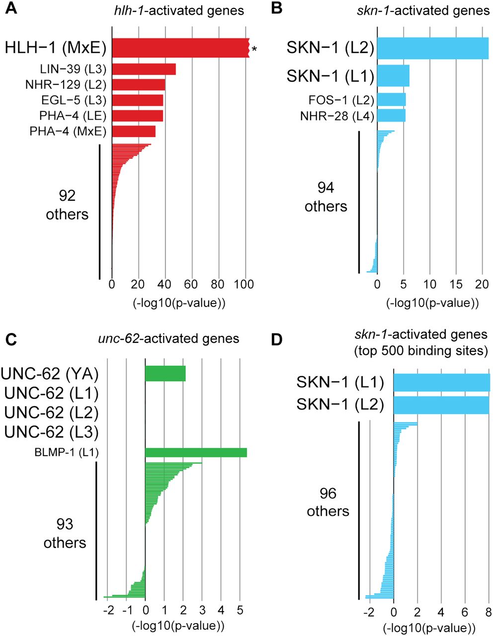 Identifying candidate regulators of expression profiling data sets. To predict candidate regulators of genes altered in expression profiling experiments, low-complexity targets from each of the 98 ChIP-seq data sets were compared against (A) 2128 genes activated by hlh-1 (Fukushige et al. 2006; Fox et al. 2007), (B) 91 genes activated by skn-1 (Park et al. 2009), or (C) 115 genes decreased upon knockdown of unc-62 (Van Nostrand et al. 2013). For each ChIP-seq data set (y-axis), the x-axis indicates the overlap between low-complexity targets and genes altered in the transcriptome profiling experiment, with enrichment indicated by positive values and depletion by negative values. (A) HLH-1 low-complexity ChIP-seq targets in mixed embryos (MxE) showed the greatest enrichment for hlh-1–activated genes ([*] P < 10−100, χ2 = 1047 by Yates' χ2 test). (B) SKN-1 targets in L2 larvae (P = 6.3 × 10−22), followed by SKN-1 targets in L1 larvae (P = 7.5 × 10−7) showed the greatest enrichment for skn-1–activated genes. (C) UNC-62 targets did not correlate with unc-62-activated genes, potentially indicating that most genes with decreased expression upon unc-62 knockdown are secondary targets of UNC-62. (D) To control for the different number of targets between ChIP-seq data sets, we developed a score (based on a naïve Bayes classifier) for each binding site that reflects both the binding site significance (Q-value) as well as binding site complexity. This classifier was trained on the set of HLH-1 ChIP-seq targets and hlh-1–activated genes, and the 500 binding sites for each ChIP-seq data set with the highest scores were then tested on skn-1–activated genes. By use of this method, SKN-1 targets showed the greatest correlation (3.6-fold enriched, P = 7.9 × 10−9 in L1 larvae and 5.1-fold enriched, P = 9.8 × 10−9 in L2 larvae) for skn-1–activated genes.