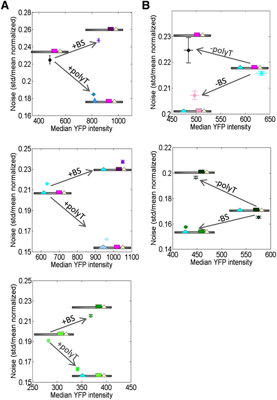 Adding poly(dA:dT) tracts and strengthening transcription factor binding sites have opposing effects on transcriptional noise. (A) Adding a poly(dA:dT) tract results in a similar increase in mean expression level but in lower noise compared with strengthening the affinity of a transcription factor binding site. For three sets of promoter variants (three different graphs), shown are the median YFP expression (x-axis) and expression noise (standard deviation of expression divided by the mean expression) of a starting promoter (leftmost promoter in each graph with lowest median YFP expression) and two promoters representing modifications to the starting promoter, in which either a poly(dA:dT) tract was added (bottom right promoter in each plot) or the binding site was strengthened (top right promoter in each plot). Note that both promoter modifications result in similar mean expression levels, but the promoter in which the poly(dA:dT) tract was added always has lower noise. Bars denote standard error. (B) Same as A, but where the starting promoter contained a poly(dA:dT) tract and a strong transcription factor binding site, and the modifications either deleted the poly(dA:dT) tract (top left promoter in each plot) or weakened the binding site (bottom left promoter in each plot). As in A, both promoter modifications result in similar mean expression levels, but the promoter with the poly(dA:dT) tract always has lower noise.