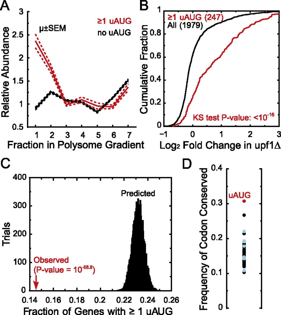 uAUGs are an underrepresented and conserved sequence element associated with decreased translation. (A) TATL-seq sedimentation pattern for uAUG-containing and all TLs. Relative abundance (ordinate) is the abundance of a given TL in a fraction divided by its abundance across the entire gradient. (B) Fold change in mRNA steady-state levels for single TL genes, either with uAUG-containing TLs or with all TLs. Numbers in parentheses indicate number of genes. (C) The fraction of uAUG-containing TLs was calculated based on observed TL lengths for single TL genes (red arrow) and 10,000 randomizations of gene-specific TL length (histogram). P-value based on Z-score of the observed value compared to histogram. (D) Conservation of each of 64 possible uNNN trinucleotides in the TL region was calculated using a genome-wide alignment of S. paradoxus, S. mikatae, S. bayanus, and S. cerevisiae and single TL genes. The ordinate is the number of conserved instances over the total occurrences of that trinucleotide. Near-uAUG trinucleotides are highlighted in blue.