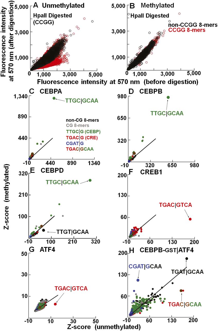 The effects of methylation on DNA binding properties of B-ZIP proteins. (A,B) Validation of CG methylation using methylation-sensitive (HpaII) endonuclease. The 40K feature microarray is scanned at 570 nm to detect Cy3-cytosine spiked into the DNA double-stranding reactions. Fluorescence intensities before and after methylation were normalized. DNA features containing CCGG are in red. Fluorescence intensities on (A) unmethylated and (B) methylated arrays before and after HpaII digestion. (C–H) Z-scores for all 32,896 8-mers from unmethylated and methylated 40K feature microarray. Lines are fitted to the non-CG 8-mers, which show no change in Z-scores between unmethylated and methylated arrays and serve as an internal control. The 8-mers are color-coded: CG (gray), non-CG (black), TTGC|G (green), TGAC|G (red), CGAT|G (blue), and chimeric CRE|CEBP sequence TGAC|GCAA is shown in brown. The best-bound 8-mers are indicated by arrows. (C) CEBPA-GST. (D) CEBPB-GST. (E) CEBPD-GST. (F) CREB1-GST. (G) ATF4-GST. (H) CEBPB-GST|ATF4.