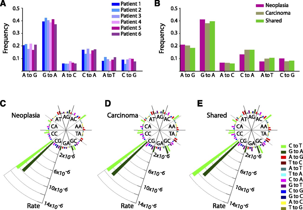 Mutation spectra and rates of somatic SNVs. (A) Mononucleotide substitution frequencies by patient. (B) Mononucleotide substitution frequencies by SNV class. (C) Dinucleotide substitution rates of SNVs private to early neoplasias. (D) Dinucleotide substitution rates of SNVs private to carcinomas. (E) Dinucleotide substitution rates of SNVs shared among neoplasias and carcinomas. For C–E, SNVs are pooled across patients. The mutated dinucleotide is indicated in the inner circle, and the substitution occurring within it is color coded. Rate is defined as mutations per dinucleotide of that class.
