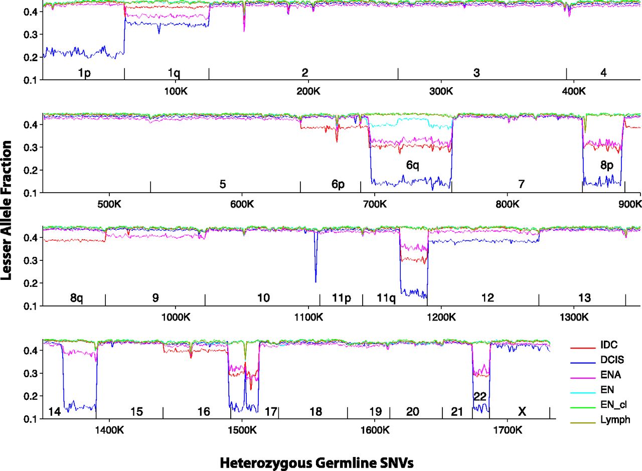 Lesser allele fraction plot of Patient 6. SNVs are arranged by their order in the genome, and LAF is plotted for each sample in windows of 1000 SNVs with 500 SNV overlap. Aneuploidies are visible as precipitous drops in the LAF, which are often shared between samples. Chromosome boundaries are indicated by short vertical lines. All samples are plotted and give highly consistent LAFs for chromosomes that are euploid.
