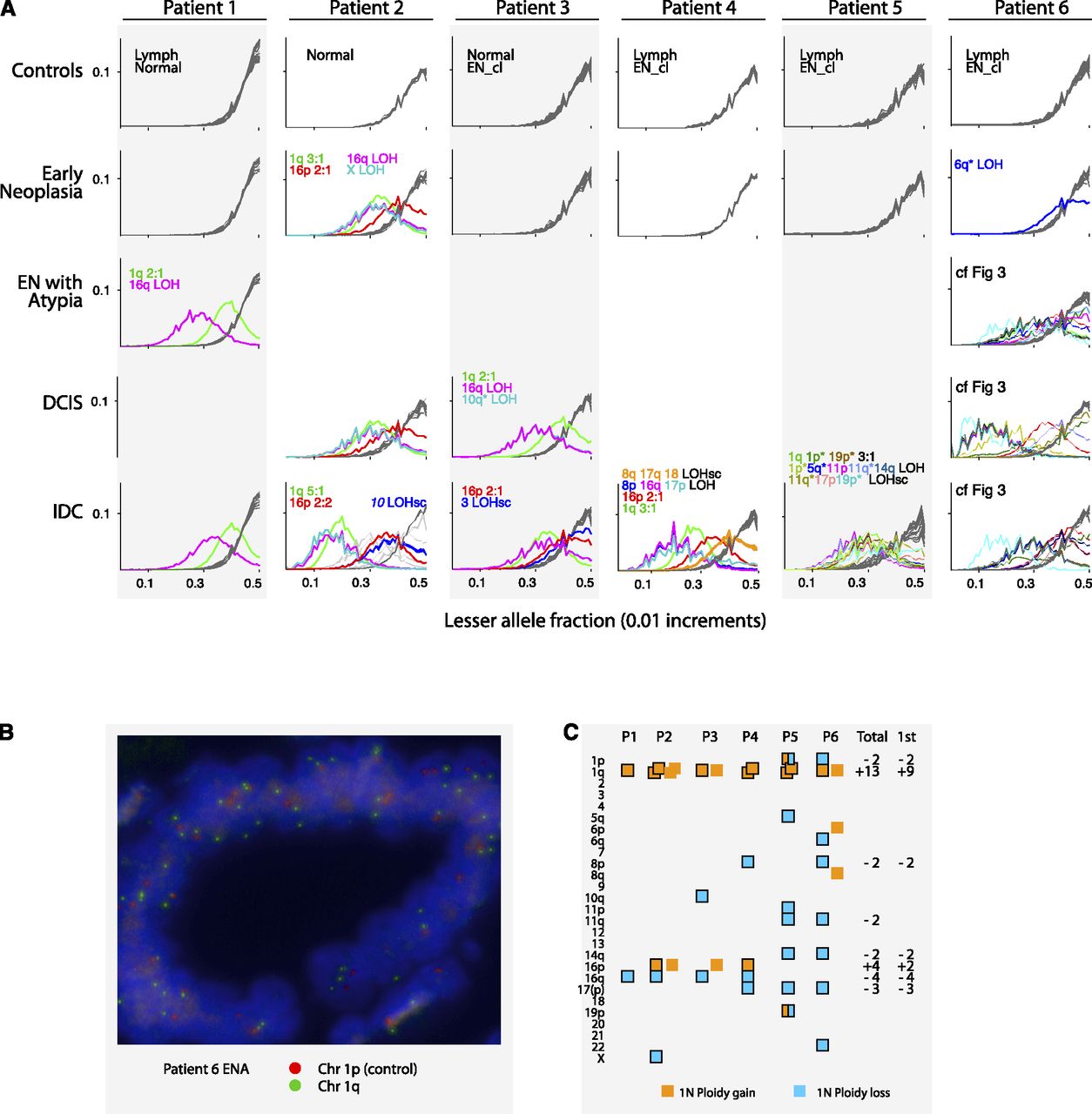 Aneuploidy summary. (A) LAF distributions for each chromosome across all patients and samples. In each sample-by-patient panel, the LAF distributions of all chromosomes are superimposed. In the absence of aneuploidy, the plot lines of all chromosomes are well-aligned, as is evident in the control plots and some EN plots. Control panels often contain plots from two samples (indicated) and so there are sometimes 46 lines superimposed, revealing the robustness of the LAF metric across samples and chromosomes. A chromosome's plot line is gray when it does not deviate from the typical distribution. The line is colored when the chromosome's LAF is skewed. Distinct colors are assigned to represent aneuploid regions that recur in different samples and patients. Colors are labeled in the panel in which they first appear. For Patient 6 please see Figure 3. (B) FISH of chromosome 1 in ENA of Patient 6. (C) Distribution of aneuploidies by patient, excluding those in IDC subclones. Each square denotes a unit gain (orange) or loss (blue). In Patients 2, 3, and 6, two phases of aneuploidies occurred, with those of the second phase not surrounded by a border. (Total) The total number of chromosomes lost (−) or gained (+) across all patients; (1st) the number during the first detected phase. Only recurrent events are listed. In Patient 5 (which exhibits hallmarks of chromothripsis), different pieces of chromosomes 1p and 19 underwent simultaneous losses or gains.