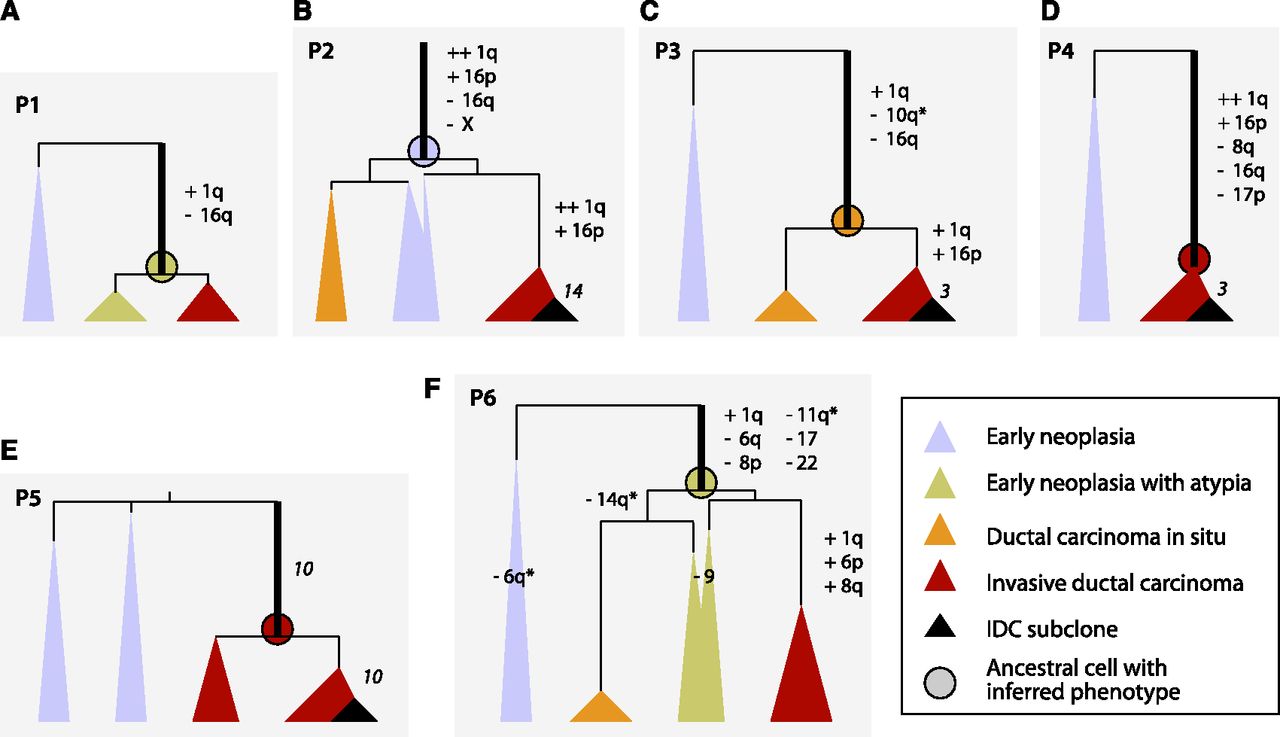 Genome evolutions of all patients (P1–P6). Vertical black lines are ancestral lineages whose lengths are proportional to the number of SNVs that occurred in each (except Patient 4, which is 50% shorter for fit). Cones represent tissue samples; cone width represents approximate amount of tissue; cone height is constrained at the top by the position of the last common ancestral cell of the sample, which is determined by the ancestral branch lengths, and on the bottom by the time of surgery, which is the same for all samples. The ratio of cone width to height is an approximation of the rate of cell division in each sample since the last common ancestral cell. Chromosome ploidy changes are indicated with the chromosome number; stand-alone numbers in italics indicate the number of chromosomes affected by subclone evolution (or putative chromothripsis in Patient 5). Thick branches are the earliest branches for which we are able to infer genomic events. Circles at the end of thick branches are ancestors with the colors denoting their inferred neoplasia-like, DCIS-like, or IDC-like phenotypes.