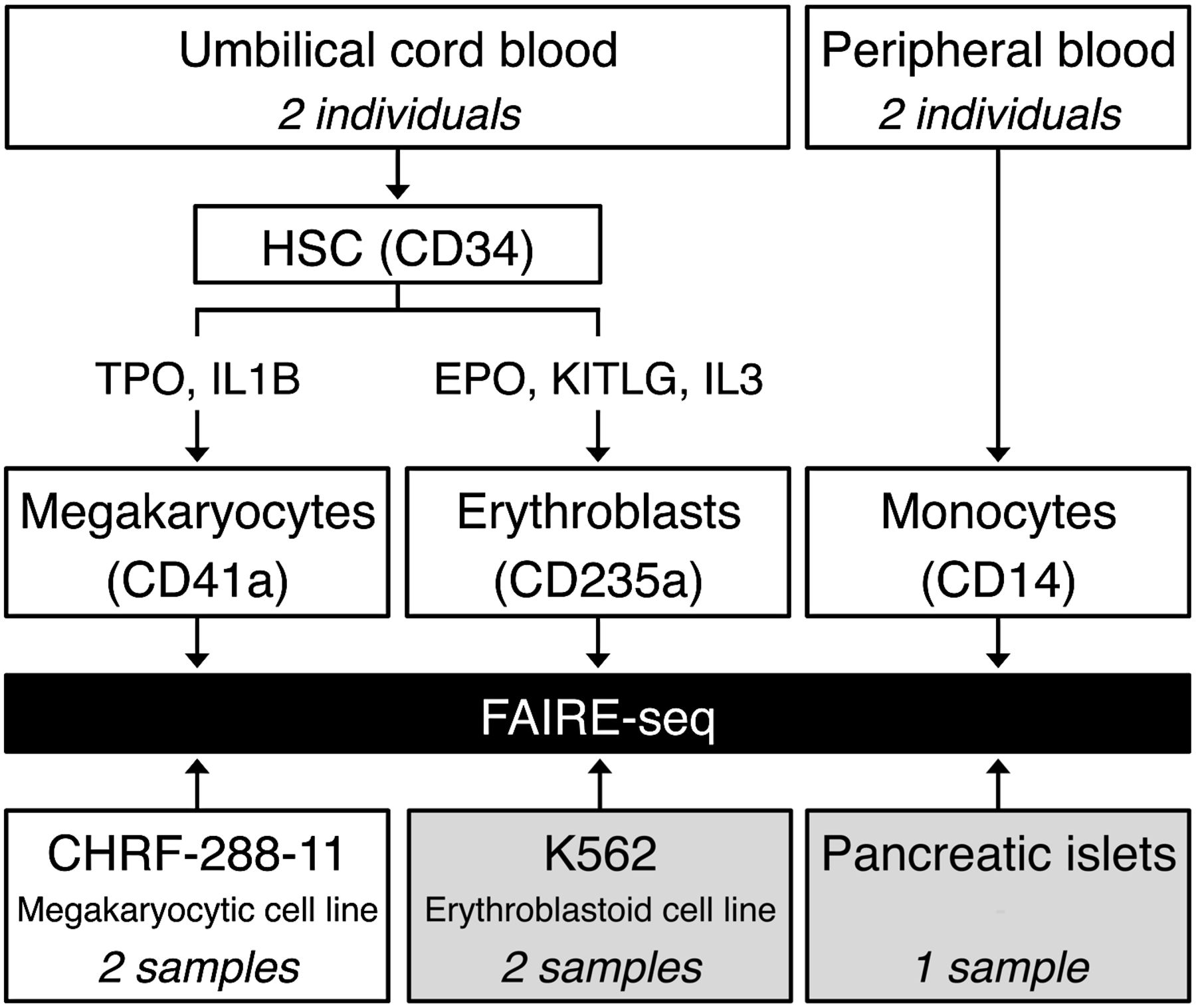 Overview of the study design. Cord blood–derived CD34+ hematopoietic progenitor cells from two unrelated individuals were differentiated in vitro into either megakaryocytes (MKs) or erythroblasts (EBs). Monocytes (MOs) were purified from peripheral blood from another two individuals. We also prepared FAIRE samples from CHRF-288-11 megakaryocytic cells. In addition, we retrieved publicly available FAIRE-seq data sets for K562 erythroblastoid cells and pancreatic islets from The ENCODE Project Consortium (2012) and Gaulton et al. (2010), respectively, and reanalyzed the data sets in concordance with all other FAIRE data sets. (HSC) Hematopoietic stem cell; (TPO) thrombopoietin; (IL1B) interleukin 1, beta; (EPO) erythropoietin; (KITLG) KIT ligand (also known as SCF, or stem cell factor); (IL3) interleukin-3.