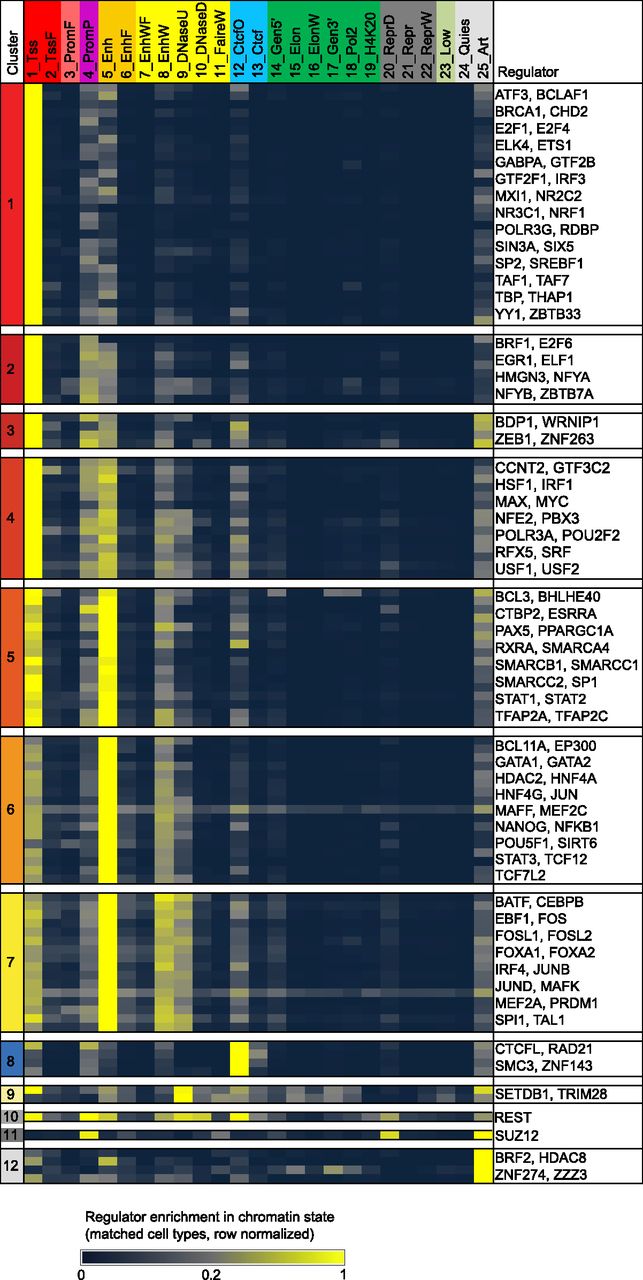 Regulator enrichments for each chromatin state in matched cell types. Different regulators show distinct chromatin state preferences. For each regulator with matching chromatin data, the average enrichment is shown for each chromatin state (columns). Enrichments have been row-normalized, scaling by the largest enrichment value for each experiment. K-means clustering with 12 clusters produced the clusters labeled C1–C12.