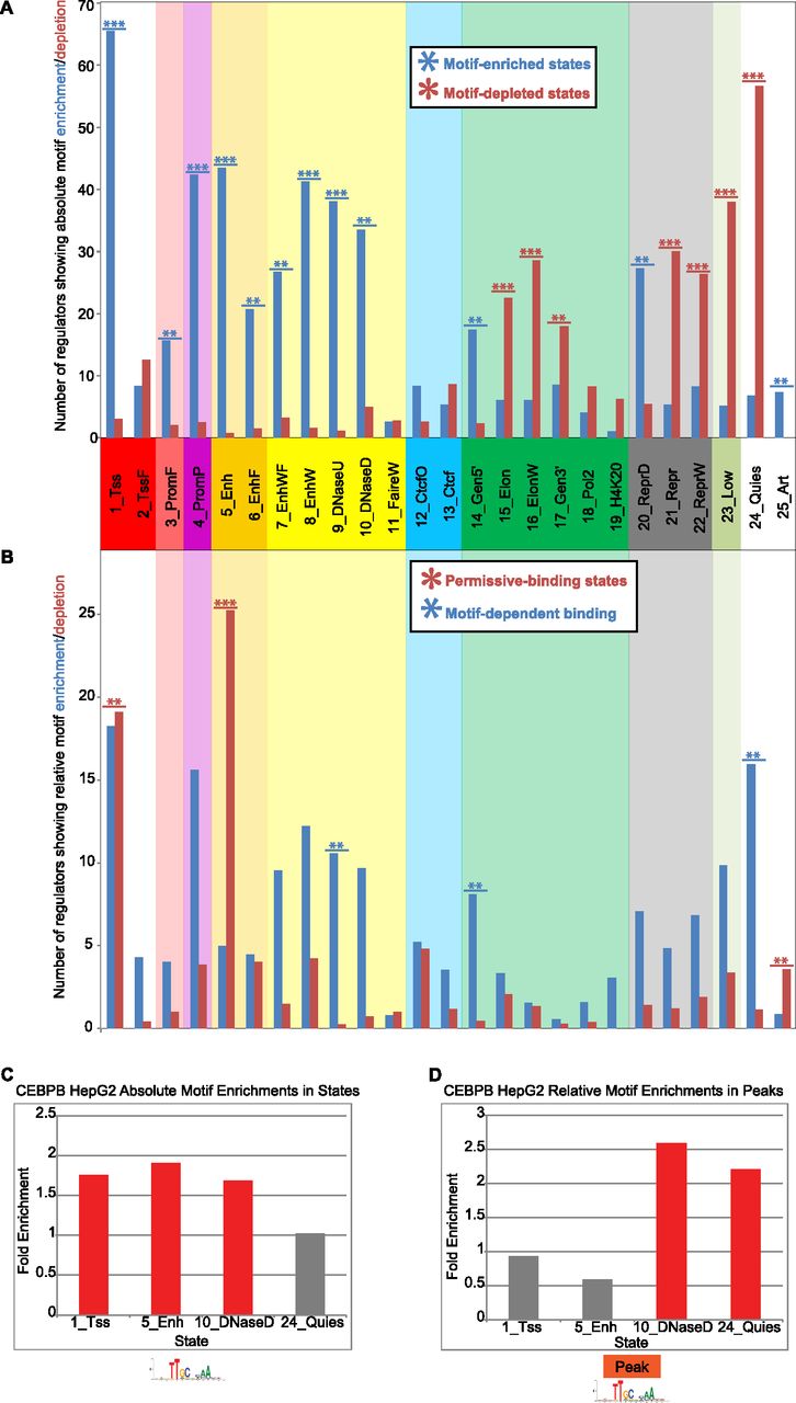 Motif enrichment and depletion variation across chromatin states. (A) Number of transcription factors with significantly enriched or depleted motif instances in each state at a P-value of 0.001 (see Methods). The maximum value for the y-axis was 79, corresponding to the number of transcription factors considered with regulatory motif instances available. If a transcription factor was profiled multiple times, each experiment was counted inversely proportional to the number of times it was profiled. Stars indicate if the number of transcription factors with significantly enriched (depleted) motifs in a state is significant based on a binomial distribution with the number of samples equal to the total number of significant enrichments or depletions in the state and the probability of success equal to the proportion of significant enrichments (depletions) of all significant enrichments or depletions across all states. Fractional values were first rounded to the nearest integer for the calculation. The P-value cutoff for triple stars was 10−6 and for double stars was 0.01. (B) Number of transcription factors with significantly enriched or depleted motif instances in each state conditioning on regions falling within a peak. Stars were computed the same way as in A except a 0.05 P-value cutoff was used for double stars. (C) Fold enrichment for CEBPB motifs in four different HepG2 chromatin states. (D) Fold enrichments for CEBPB motifs within peaks in the same four states relative to the baseline motif enrichment in peaks.