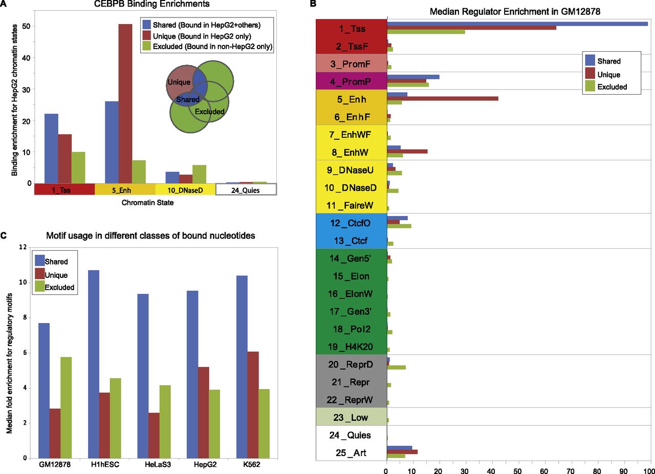 Dynamic binding enrichments. (A) The enrichment in four HepG2 chromatin states for locations of the genome that are bound by CEBPB in HepG2 and another cell type, only in HepG2, and in another cell type but not HepG2. (B) The median enrichment over all regulators in Gm12878 for the three different classes of dynamic binding (for other cell types, see Supplemental Figs. 19, 20). (C) The median enrichment of regulatory motifs in bound regions for the different classes of dynamic binding.