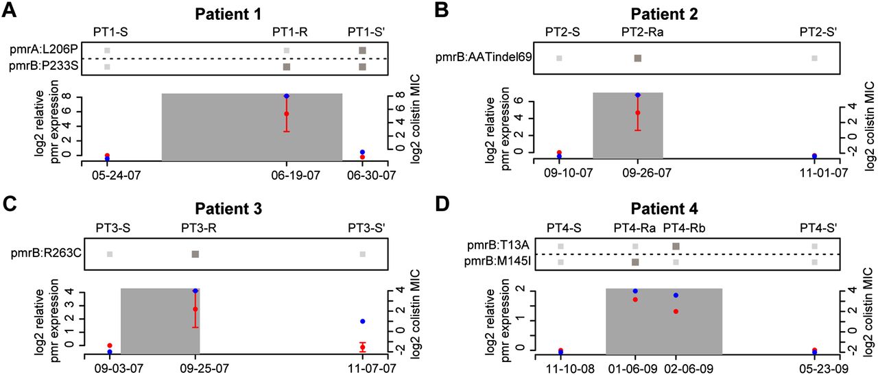 Mutations at pmr locus account for altered pmr expression and colistin MICs. (A–D) The relationship between pmr genotype, pmr transcript level, and colistin MICs is shown for patients 1 through 4. The x-axis of each plot represents time, with the date of each isolate labeled. The left y-axis of each plot represents the pmr expression relative to the initial patient isolate and corresponds to red points. The expression values and error bars are based on the mean and standard error of three replicate experiments. The right y-axis of each plot represents the isolates MICs and corresponds to blue points. The heatmap above represents the presence/absence (dark/light gray) of mutations to the pmr observed in each patient's isolates.