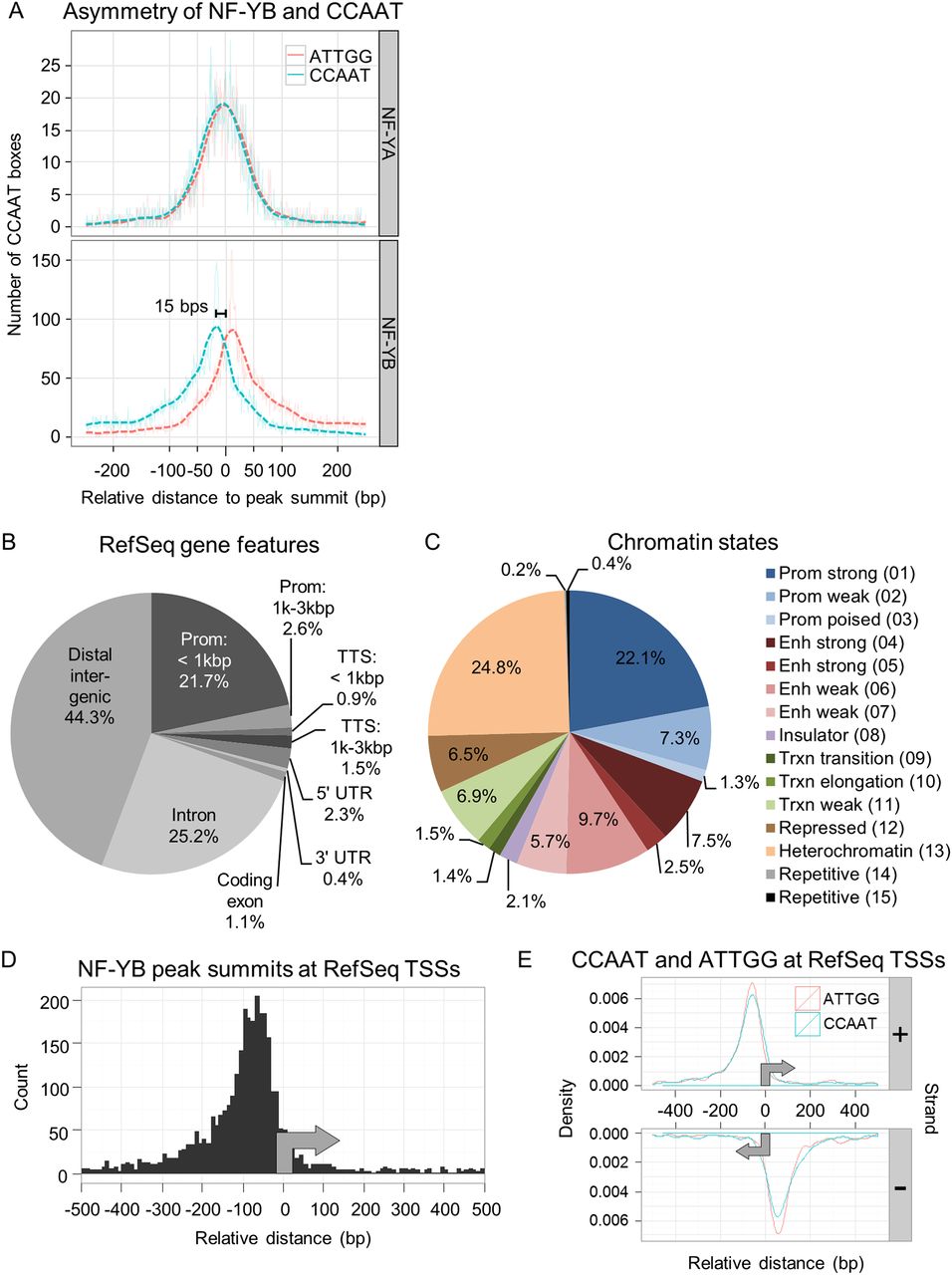 Annotation of NF-Y peaks to genomic features. (A) Kernel density estimate of the distribution of the 5′-CCAAT-3′ and 5′-ATTGG-3′ sequences under NF-YA and NF-YB peaks in relation to the peak summit centered at 0 bp. Only the position of the best matching CCAAT motif within 100 bp of the peak summit is considered and plotted. (Solid and dashed lines) Raw and Gaussian smoothed data, respectively. (B) Annotation of K562 NF-YB sites to RefSeq gene features. (C) As in B, except chromatin state maps are used. (Prom) promoter; (enh) enhancer; (trxn) transcription. Numbering is from the chromatin state maps of Ernst et al. (2011). (D) Frequency distribution of K562 NF-YB peak summits at RefSeq TSSs showing a preferential location between −50 and −100 bp upstream of the TSS. (E) Gaussian kernel density estimate of the distribution of positive and negative strand 5′-CCAAT-3′ and 5′-ATTGG-3′ sequences at K562 NF-YB-bound RefSeq TSSs. Only the best motif per region is considered. Bandwidth is equal to the standard deviation of the smoothing kernel. (Gray arrows) Direction of transcription.