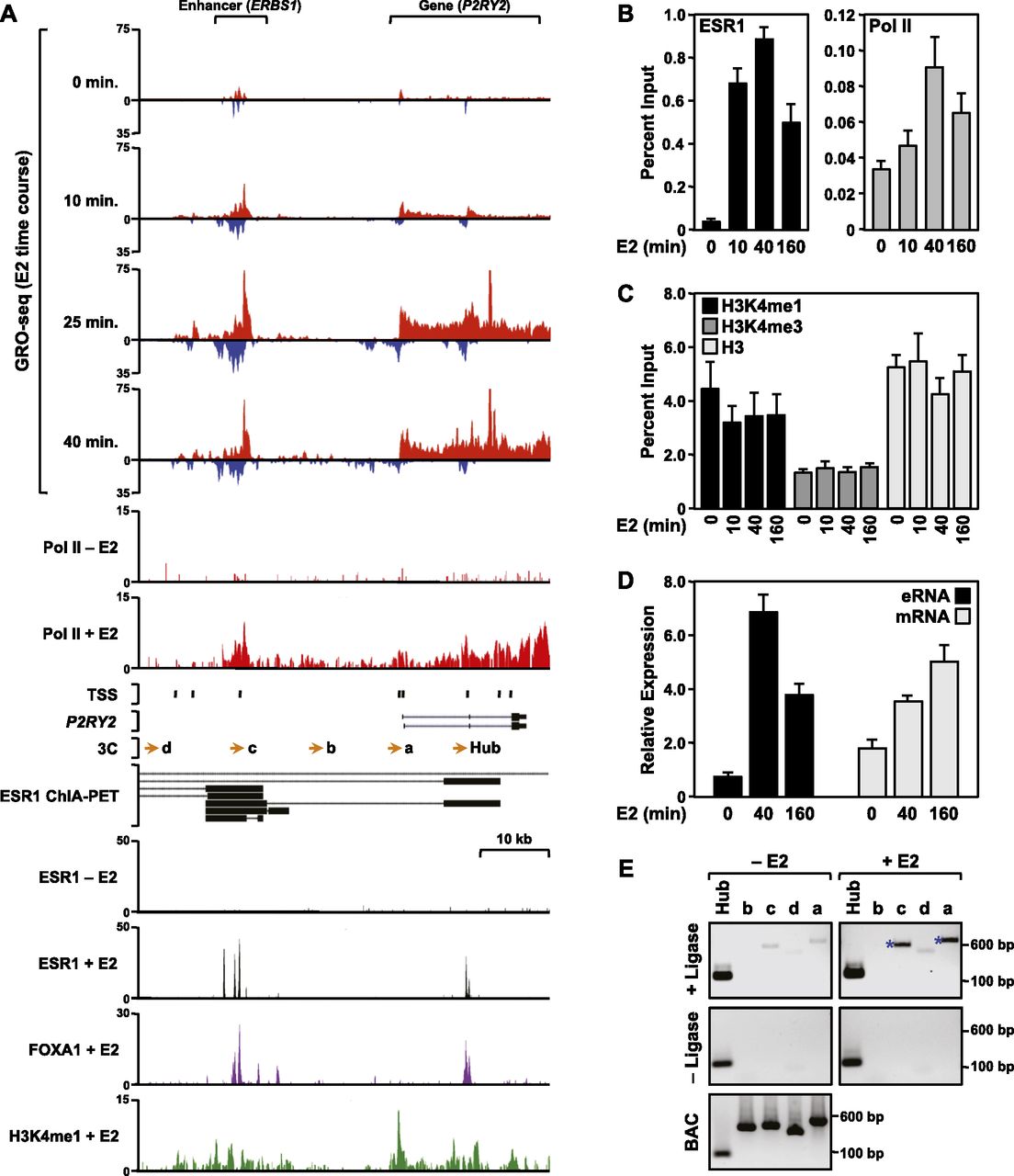 The ESR1 enhancer of the estrogen-responsive P2RY2 gene produces bidirectional transcripts in MCF-7 cells. (A) Browser tracks of GRO-seq, ChIP-seq (Pol II, ESR1, FOXA1, and H3K4me1), ChIA-PET, TSS locations, and gene annotation for P2RY2 and its distal ESR1 binding site (ERBS1). The data are from MCF-7 cells treated with a time course of E2 (GRO-seq) or a single time point of E2 (45 or 60 min). TSSs identified previously based on a published data set from MCF-7 cells (Yamashita et al. 2011) are located as indicated. (Orange arrows) The locations of primers used for 3C assays. The black bars shown for the ChIA-PET data indicate the “head” and “tail” making contact in the gene loops, which are indicated by the dotted black lines. Scale bars show the length of the indicated region. A more detailed set of genomic data for P2RY2, as well as data for additional enhancer/gene pairs, can be found in Supplemental Figures 1 and 2. (B,C) ChIP-qPCR analyses showing recruitment of ESR1 and Pol II (B) or levels of H3K4me1, me3, and H3 (C) at ERBS1 in response to a time course of E2 treatment. Each bar represents the mean + the SEM for three or more independent biological replicates. (D) RT-qPCR analyses showing the expression of ERBS1 eRNA and P2RY2 mRNA in response to a time course of E2 treatment. Each bar represents the mean + the SEM for three or more independent biological replicates. (E) 3C-PCR assay showing E2-induced looping between ERBS1 and the P2RY2 gene. The lowercase letters correspond to the primers denoted by orange arrows shown in panel A. The assays were conducted in the presence (experimental) or absence (control) of DNA ligase, as indicated. Digested and ligated bacterial artificial chromosome (BAC) DNA spanning the entire P2YR2 locus was used as a PCR control. The size of the PCR fragments in base pairs is shown. One representative experiment from three conducted is shown.
