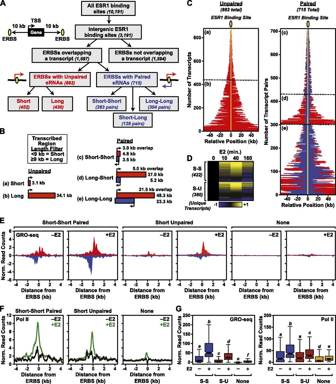 Genome-wide identification of ESR1 enhancer transcripts in MCF-7 cells using GRO-seq. (A) Flowchart of ERBS classification in MCF-7 cells based on genomic location, eRNA production, and length of the transcribed region based on ChIP-seq and GRO-seq. (B) Schematics of average transcribed regions overlapping ERBSs in MCF-7 cells in five classes: (a) short unpaired, (b) long unpaired, (c) short–short paired, (d) long–short paired, and (e) long–long paired. “Short” and “Long” indicate a transcribed region <9 kb or ≥9 kb, respectively. (Red and blue boxes) Transcription from opposite strands. (C) Graphical representation of the positions and orientations of eRNAs (indicated by red and blue lines) relative to ESR1 binding sites (indicated by yellow oval and line) for unpaired and paired eRNAs in MCF-7 cells. The position relative to the ERBS is indicated in kilobases. (a–e) Correspond to the categories shown in panel B. (Red and blue lines) Transcription from opposite strands. (D) Heat map showing the expression of E2-regulated short unpaired (S-U) and short–short paired (S-S) eRNAs over a time course of E2 treatment in MCF-7 cells based on GRO-seq data. The data were median centered and scaled to the 0-min time point. Yellow and blue indicate up-regulated and down-regulated transcripts, respectively. Only unique transcripts are shown (i.e., those transcripts that overlap more than one ERBS are represented once). (E) Metaplot analyses of GRO-seq reads surrounding ERBSs associated with short–short paired transcripts, short unpaired transcripts, or no transcripts in MCF-7 cells ± E2 treatment. (F) Metaplot analyses of Pol II ChIP-seq reads surrounding ERBSs associated with short–short paired transcripts, short unpaired transcripts, or no transcripts in MCF-7 cells ± E2 treatment. (G) Box plot representation of GRO-seq and Pol II ChIP-seq reads associated with short–short paired transcripts (S-S), short unpaired transcripts (S-U), or no transcripts in MCF-7 cells ± E2 treatment.