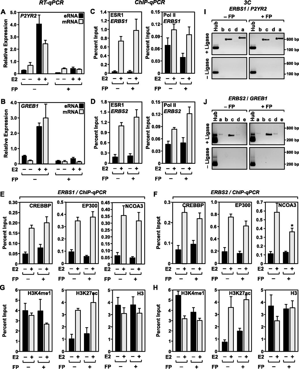 Inhibition of eRNA production by flavopiridol does not inhibit ESR1, Pol II, or coregulator binding, alter H3K4me1 or H3K27ac levels, or prevent enhancer looping at ERBSs in MCF-7 cells. Locus-specific assays for E2-responsive enhancers showing the effects of a 1-h pre-treatment with flavopiridol (FP) on various molecular outcomes in MCF-7 cells. Each bar represents the mean + the SEM for three or more independent biological replicates. (A,B) Treatment with flavopiridol inhibits the E2-dependent production and steady-state accumulation of eRNAs and target gene mRNAs. RT-qPCR analyses for selected eRNAs and mRNAs in response to E2 treatment. (A) ERBS1 eRNA/P2RY2 mRNA and (B) ERBS2 eRNA/GREB1 mRNA. (C,D) ChIP-qPCR analyses for ESR1 (left) and Pol II (right) for ERBS1 (C) and ERBS2 (D) in the absence or presence of E2 and flavopiridol, as indicated. (E,F) ChIP-qPCR analyses for CREBBP (left), EP300 (middle), and Pol II (right) for ERBS1 (E) and ERBS2 (F) in the absence or presence of E2 and flavopiridol, as indicated. (G,H) ChIP-qPCR analyses for H3K4me1 (left), H3K27ac (middle), and H3 (right) for ERBS1 (G) and ERBS2 (H) in the absence or presence of E2 and flavopiridol, as indicated. (I,J) 3C-PCR analyses showing that looping between distal ERBSs and target genes in the presence of E2 is not blocked by flavopiridol (FP). (I) ERBS1/P2RY2 and (J) ERBS2/GREB1. The lowercase letters correspond to the primers denoted by orange arrows shown in Figure 1A. The assays were conducted in the presence (experimental) or absence (control) of DNA ligase, as indicated. The size of the PCR fragments in base pairs is shown. One representative experiment from three conducted is shown.