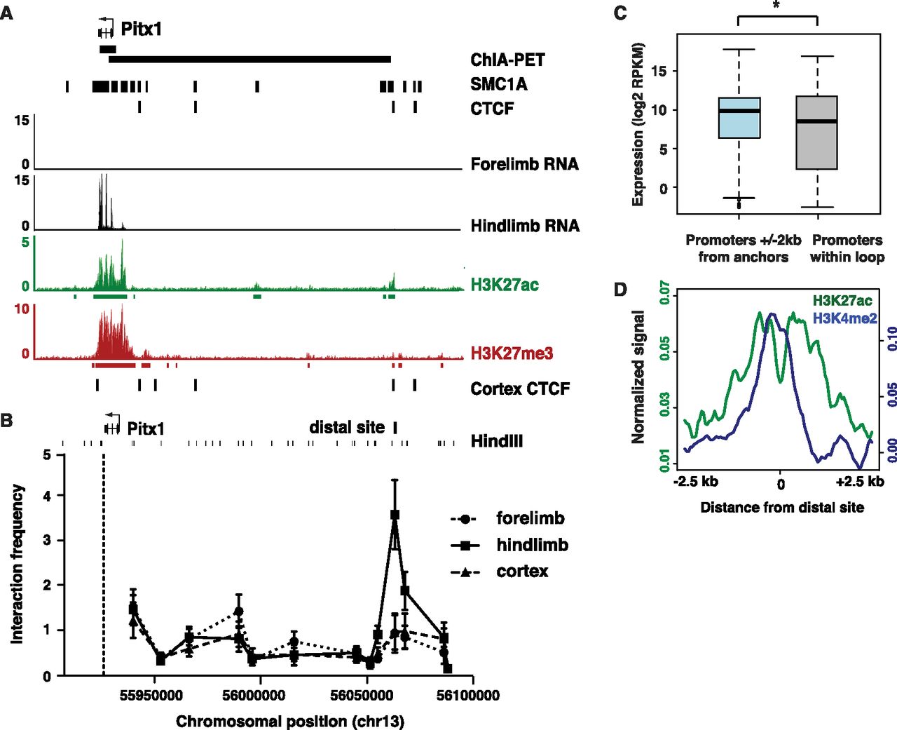 Cohesin participates in enhancer-promoter interactions. (A) SMC1A ChIA-PET interaction between Pitx1 and a distal site 133 kb upstream, bound by CTCF and SMC1A. Although E11.5 forelimb and hindlimb tissue were combined for ChIP, it has previously been shown that both Pitx1 and the distal site are marked only by H3K27ac in hindlimb and only by H3K27me3 in forelimb (Cotney et al. 2012). CTCF binding sites in E14.5 cortex are also shown (Shen et al. 2012). (B) 3C analysis of interactions at the Pitx1 locus in E11.5 forelimb, E11.5 hindlimb, and E14.5 cortex, using an anchor primer located in the gene (dashed line) and primers tiled across the locus. Interactions are normalized to a crosslinking control at Ercc3. Each data point represents average interaction frequency and error bars represent standard error from three independent qPCR reactions (see Supplemental Fig. S4A for biological replicate). (C) Promoters within 2 kb of an interaction anchor that loop to a distal site show significantly higher expression than promoters contained within the loop ([*] Wilcoxon P-value < 2 × 10−16). (D) E11.5 limb H3K27ac (green) and H3K4me2 (blue) normalized ChIP-seq signal aggregated at all distal sites looping to a promoter.
